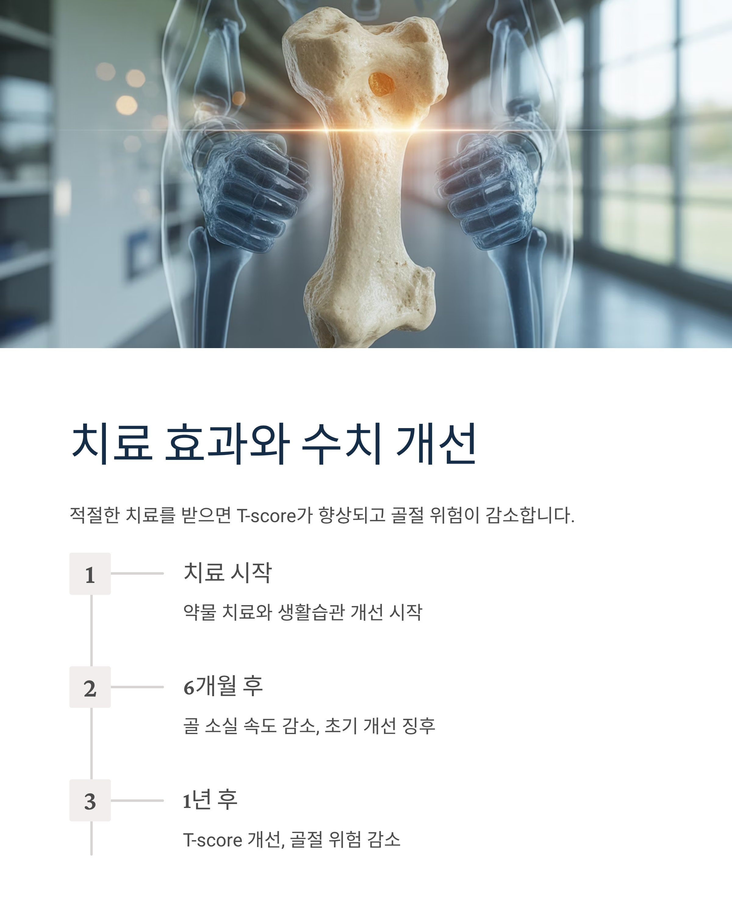적절한 치료를 받으면 T-score가 향상되고 골절 위험이 감소합니다. 실제로 꾸준한 치료를 통해 T-score를 개선시키면 골절 예방이 가능하다는 연구 결과가 많습니다.
