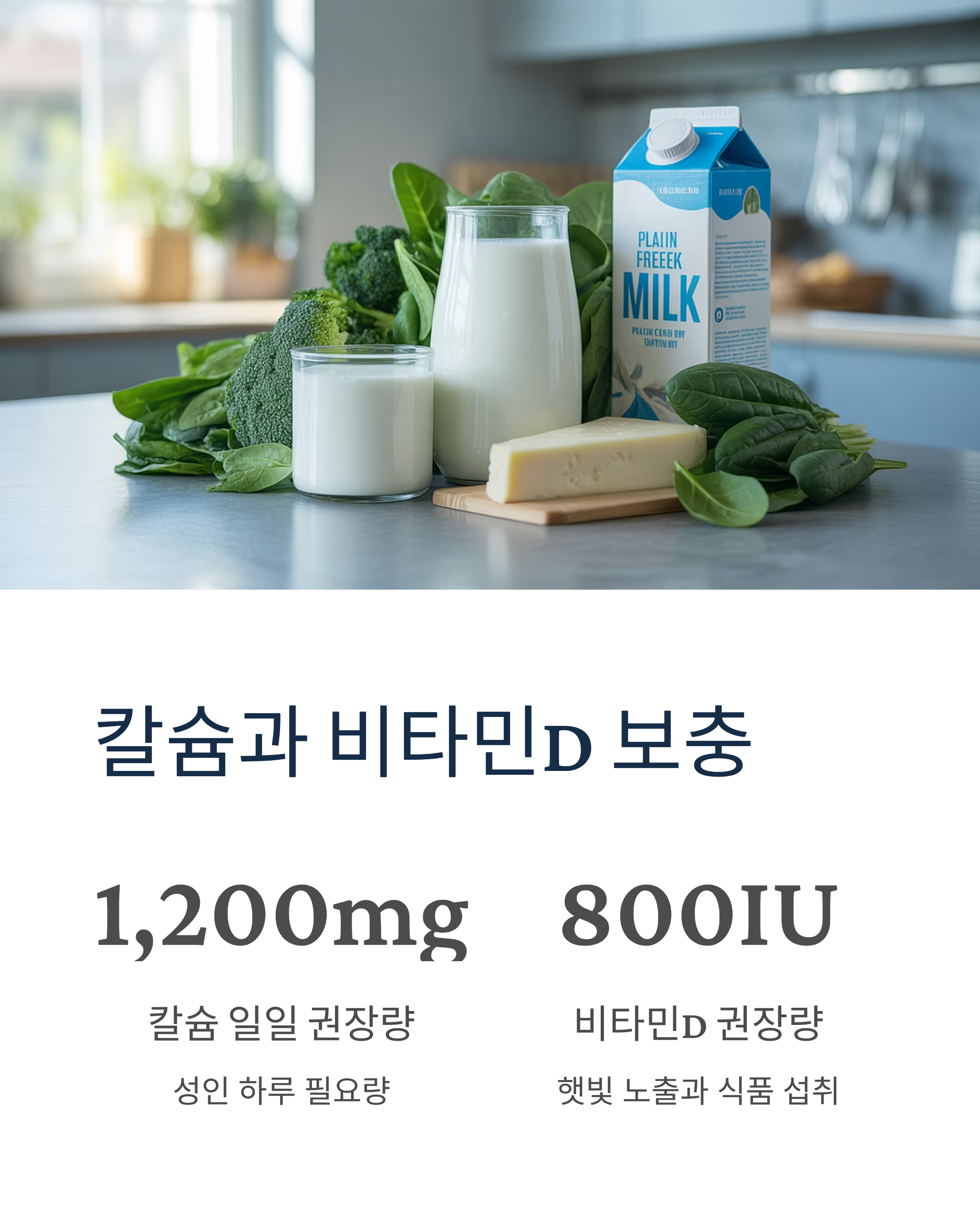 - 칼슘: 성인 하루 1,000~1,200mg 필요