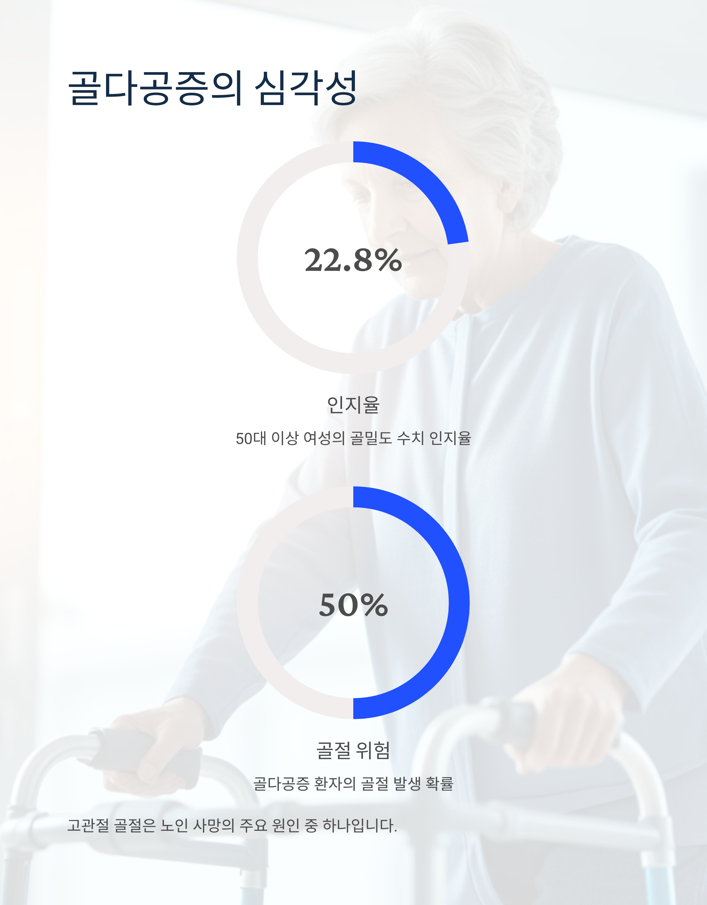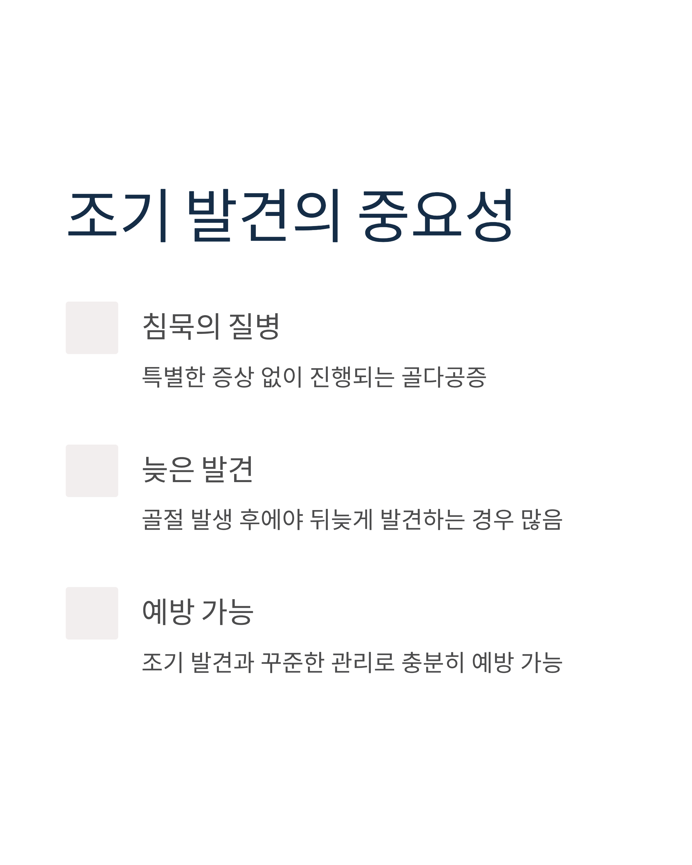 골다공증은 침묵의 질병입니다. 증상이 없어 방치하다가 골절이 발생한 후에야 뒤늦게 발견하는 경우가 많습니다. 특히 고관절 골절은 노인 사망의 주요 원인 중 하나입니다.