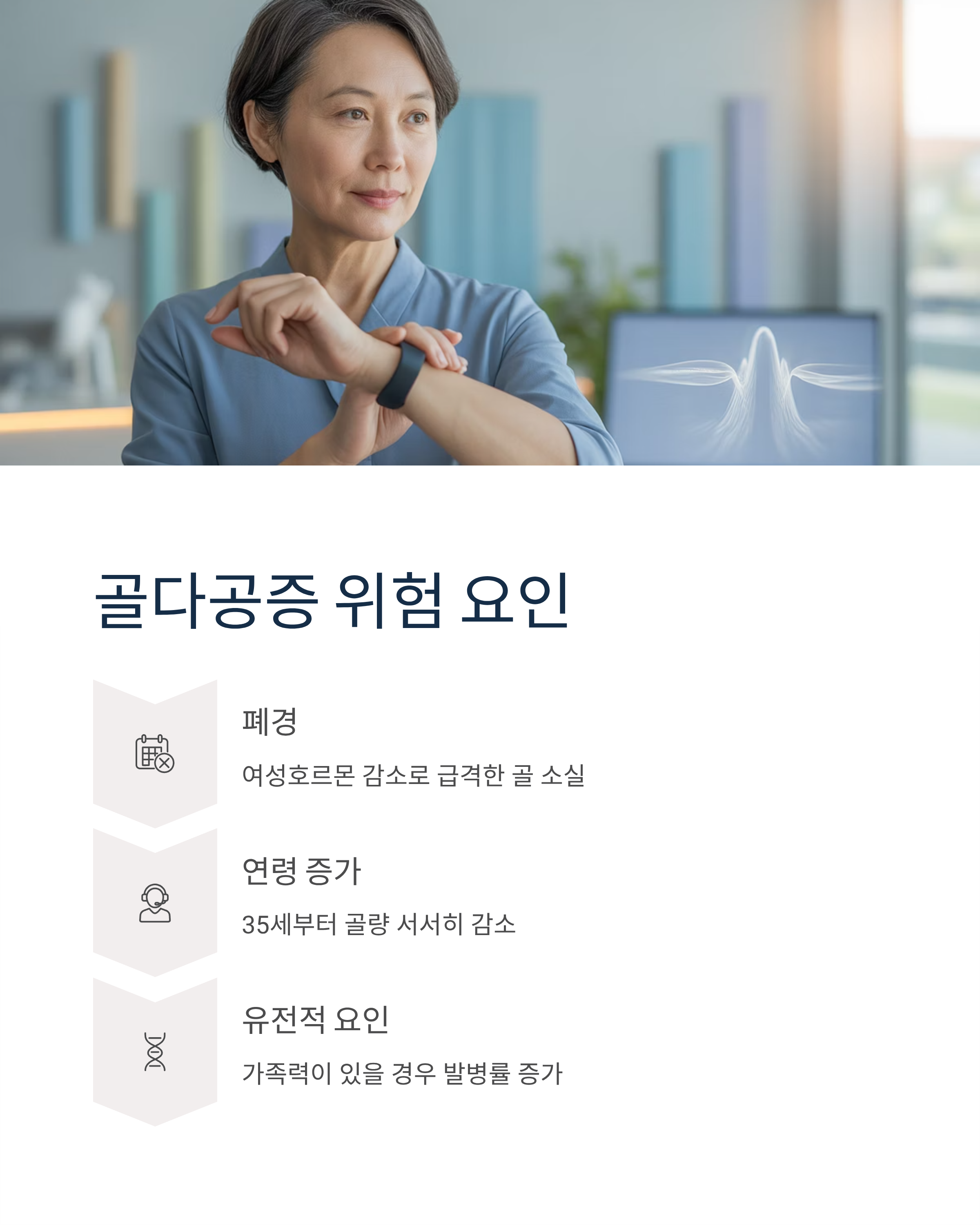 - 폐경: 여성호르몬(에스트로겐) 감소로 급격한 골 소실 발생