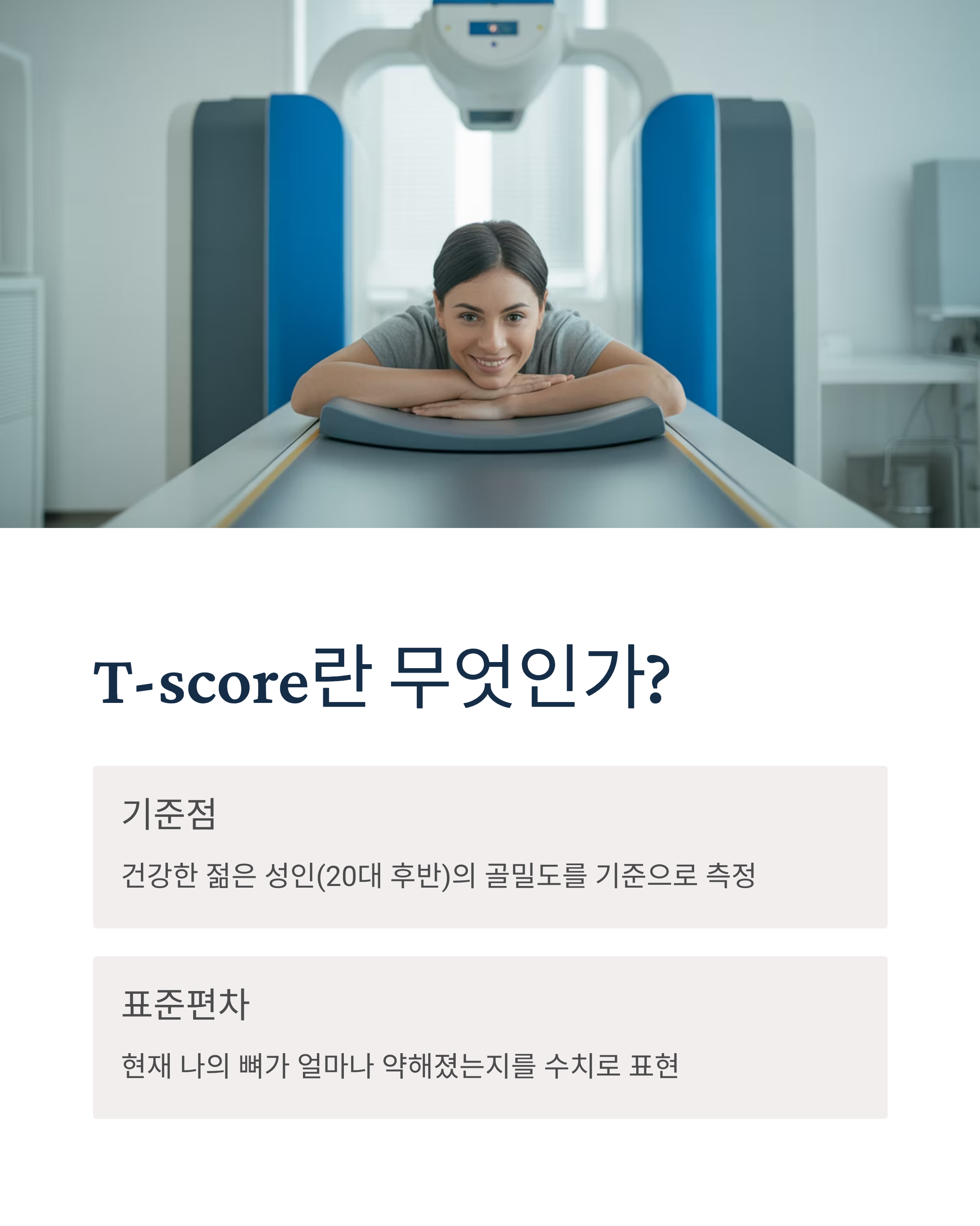 T-score는 골밀도 검사를 통해 확인할 수 있는 뼈 건강 지표입니다. 건강한 젊은 성인(20대 후반)의 골밀도를 기준으로 현재 나의 뼈가 얼마나 약해졌는지를 표준편차로 나타낸 수치입니다.