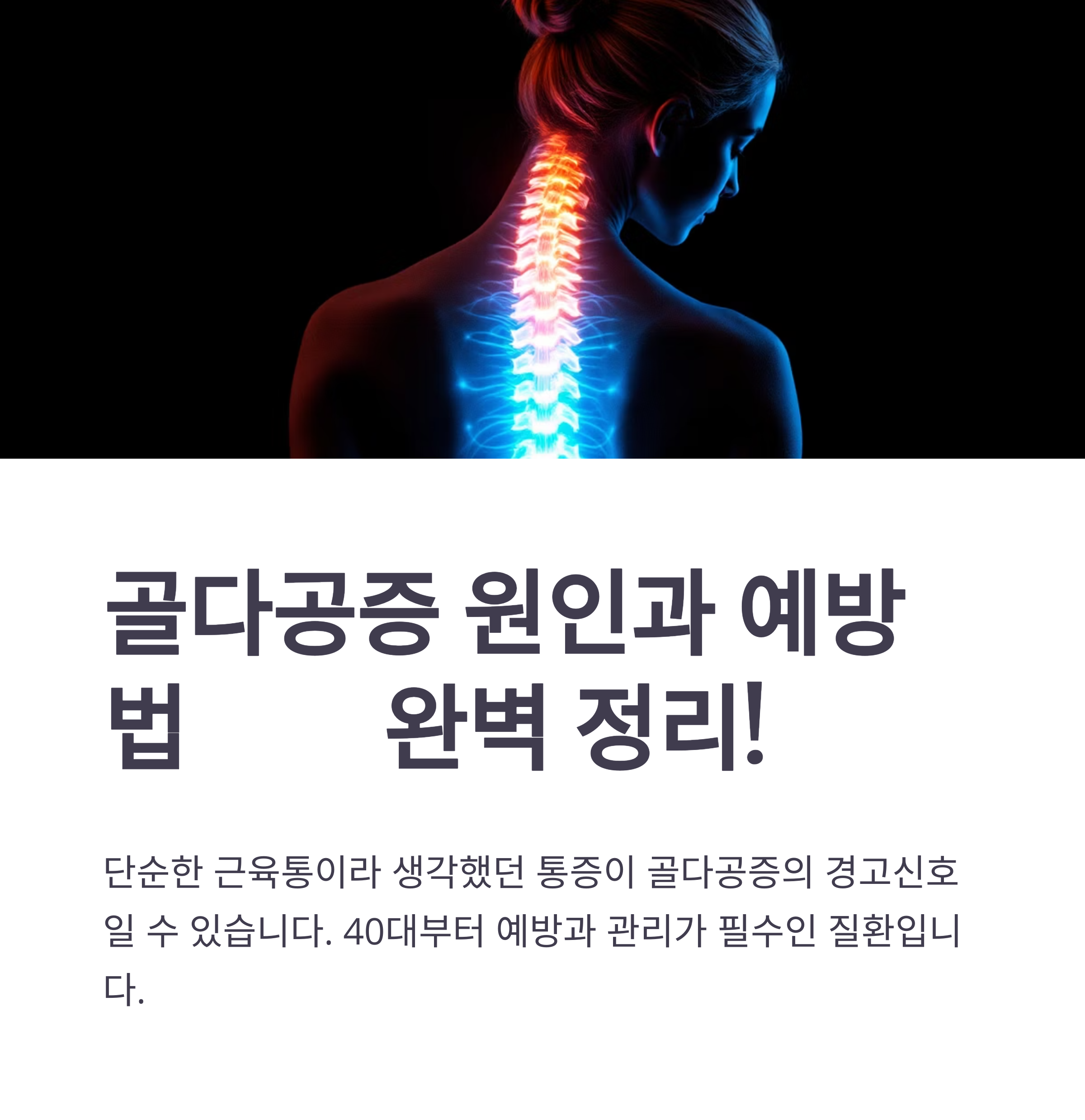 "어? 요즘 허리가 자꾸 아픈데..." 단순한 근육통이라고 생각했던 그 통증이 사실은 골다공증의 경고신호일 수 있습니다. 많은 분들이 골다공증의 원인을 '나이 들면 당연한 것'이라고 여기지만, 실제로는 40대부터 예방과 관리가 필수인 심각한 질환입니다.
