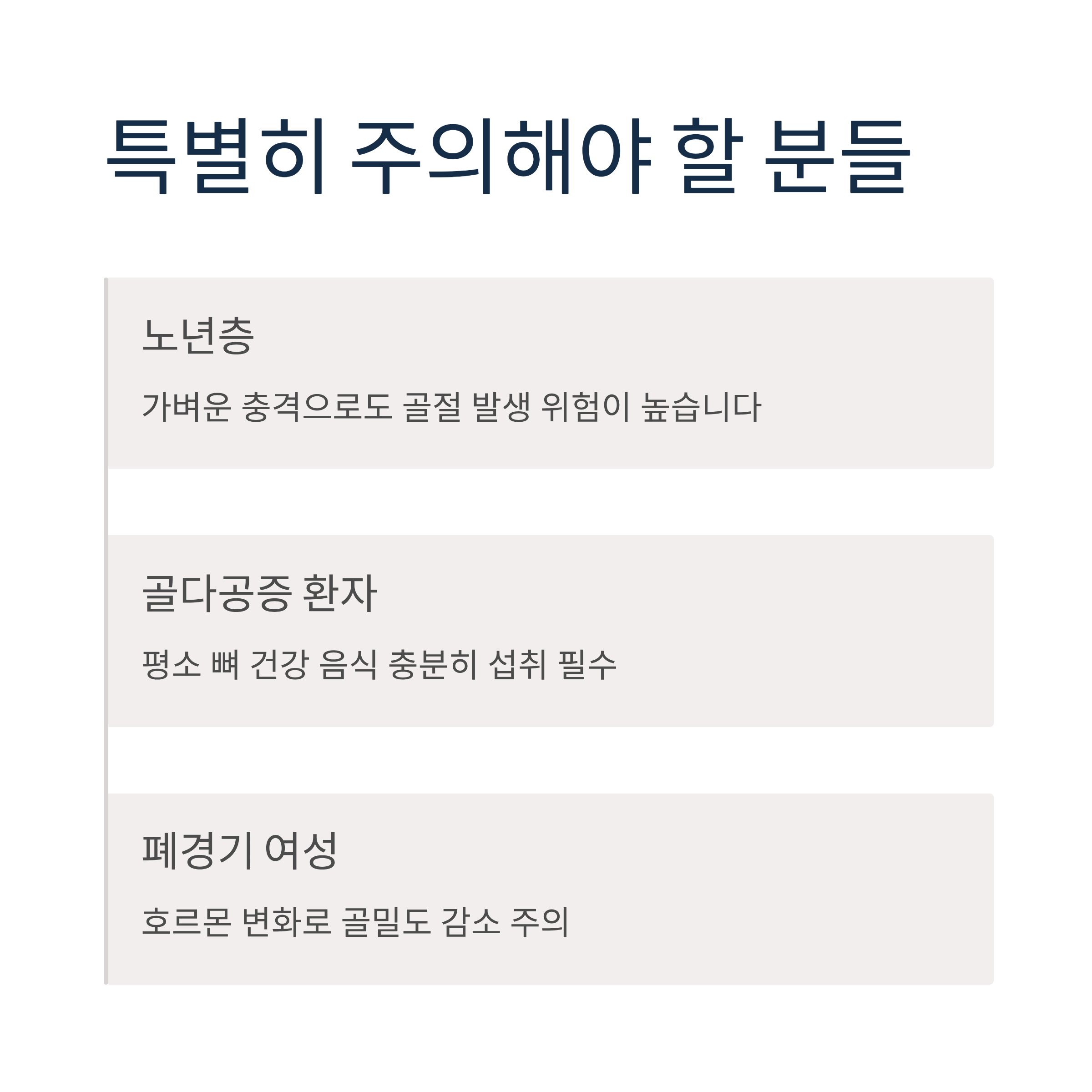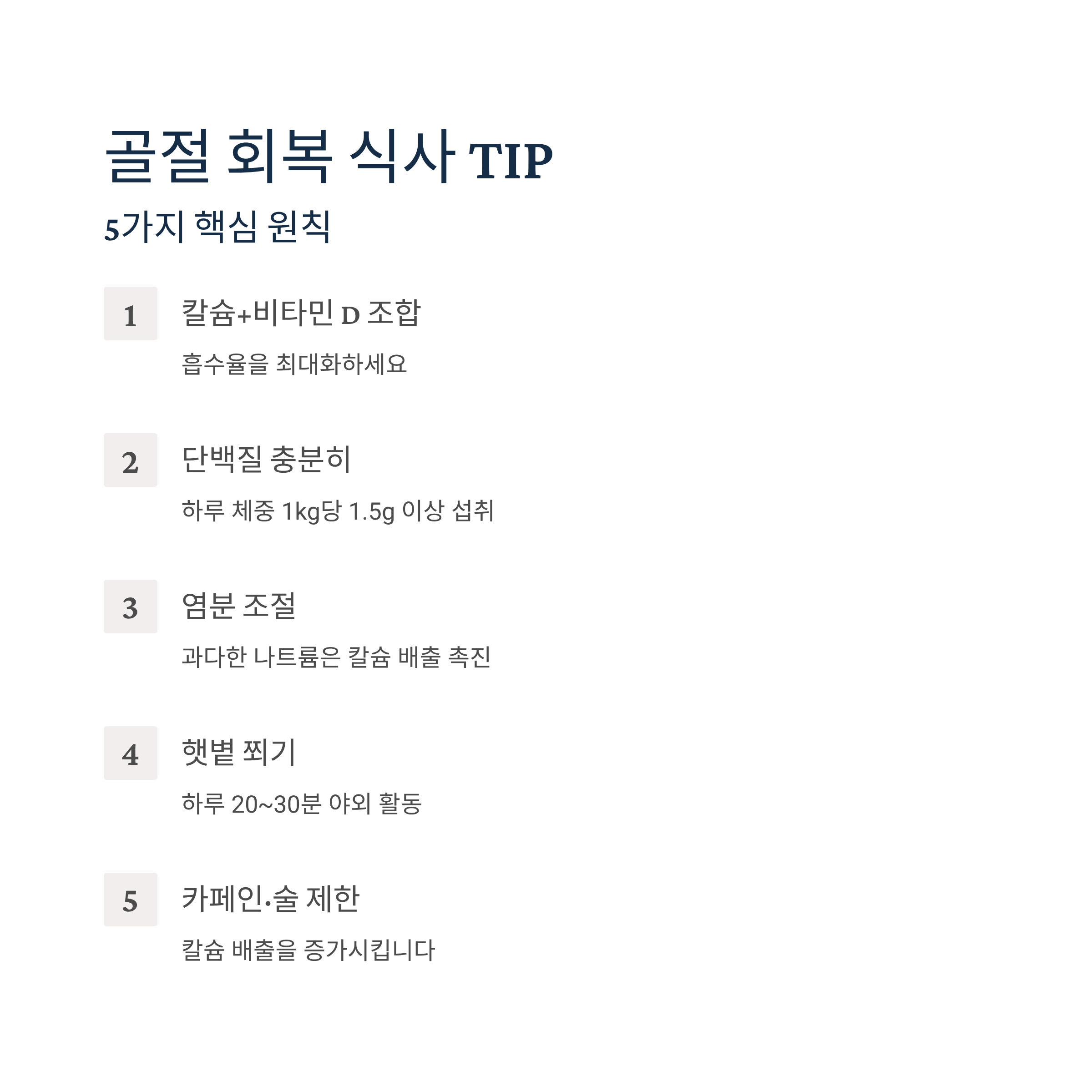골절 회복은 단순히 시간이 지나면 낫는 것이 아닙니다. 적극적인 영양 관리를 통해 회복 속도를 앞당기고, 재골절 위험을 낮출 수 있습니다. 특히 노년층이나 골다공증 환자는 가벼운 충격으로도 골절이 쉽게 발생하므로, 평소 뼈 건강 음식을 충분히 섭취하는 것이 중요합니다.