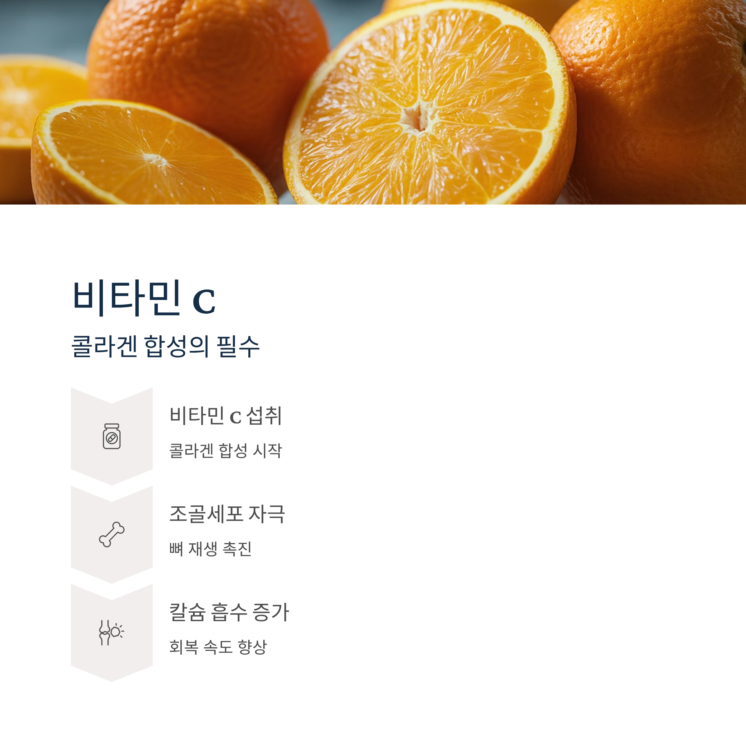 비타민 C는 콜라겐 합성에 중요하며, 조골세포를 자극하고 칼슘 흡수를 촉진합니다. 뼈의 구성 성분인 콜라겐을 만들기 위해서는 비타민 C가 반드시 필요합니다.