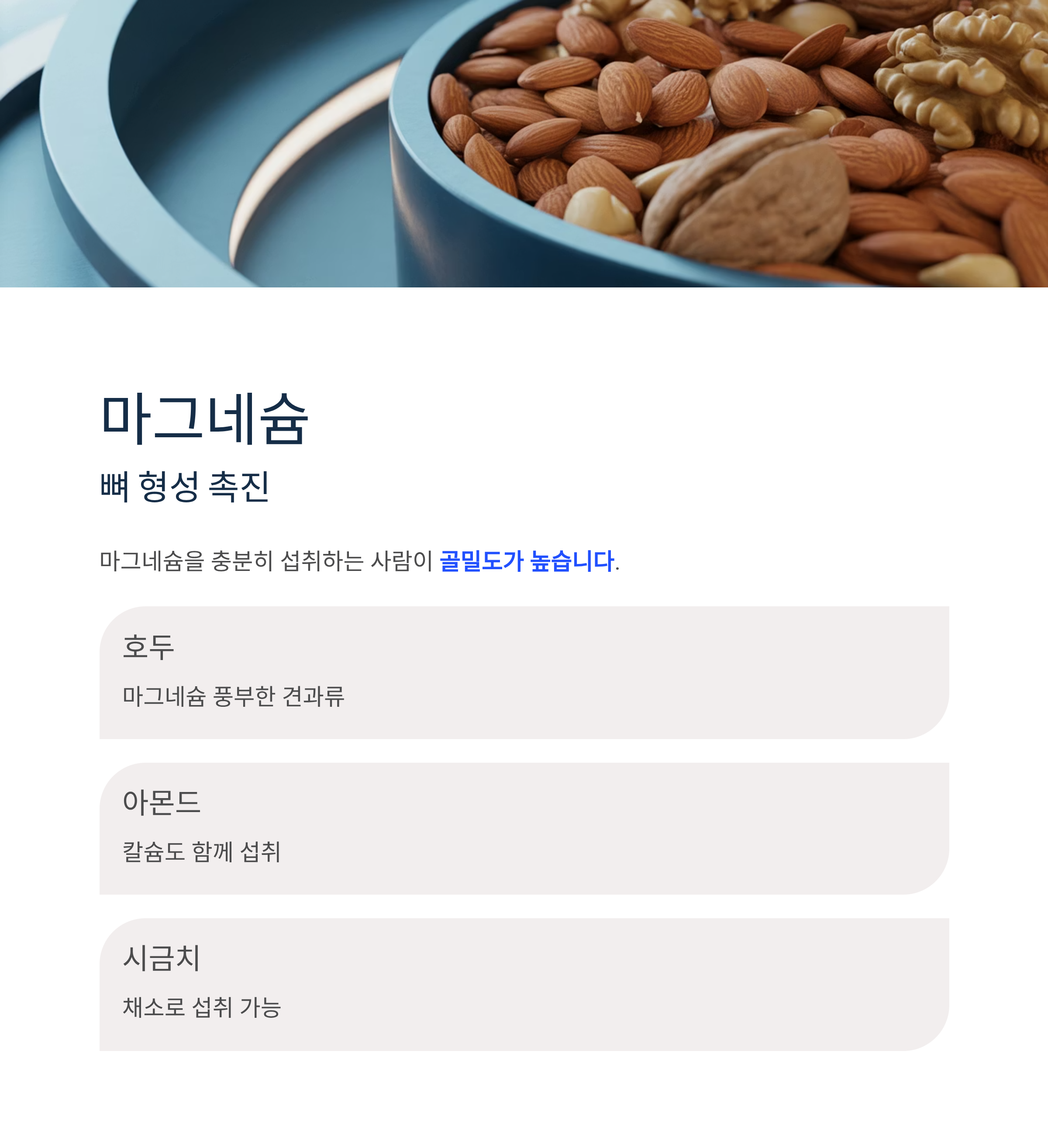 마그네슘은 뼈 형성에 도움을 주며, 연구 결과에 따르면 마그네슘을 충분히 섭취하는 사람이 골밀도가 높습니다. 견과류에 마그네슘이 풍부하게 함유되어 있습니다.