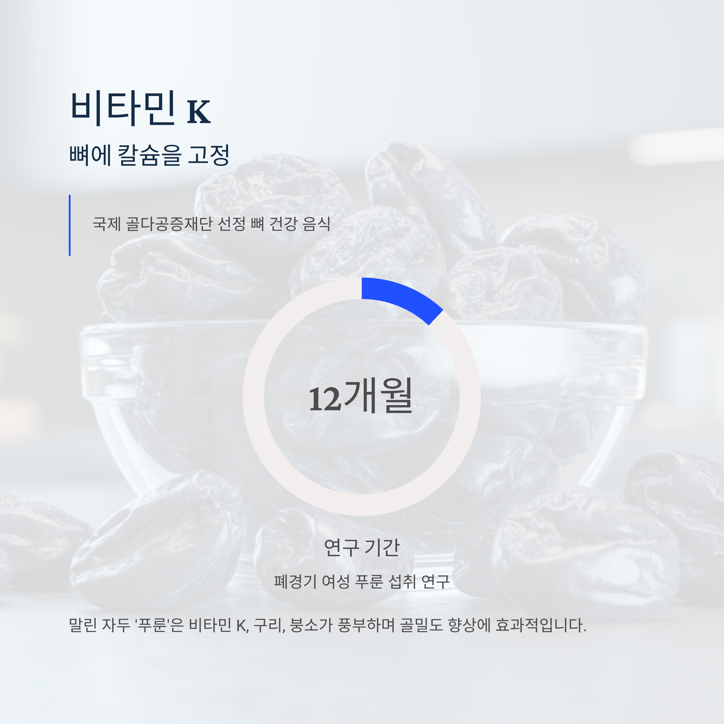 자두, 특히 말린 자두 '푸룬'은 국제 골다공증재단에서 뼈 건강을 위한 음식으로 선정되었습니다. 비타민 K, 구리, 붕소 등의 미네랄이 풍부하며, 미국 플로리다 주립대학교 연구 결과 폐경기 여성이 12개월간 푸룬을 섭취한 결과 골밀도가 통계적으로 유의미하게 향상되었습니다.