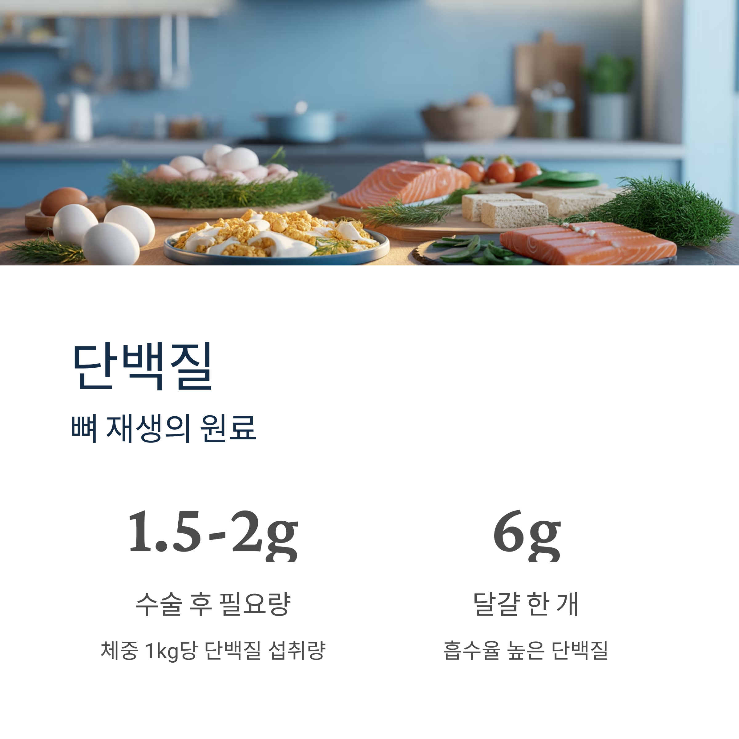 수술 후 신체는 체중 1kg당 1.5~2g의 단백질 섭취가 필요합니다. 달걀은 흡수성이 높은 단백질의 우수한 공급원으로, 큰 달걀 한 개에 약 6g의 단백질이 들어있습니다.