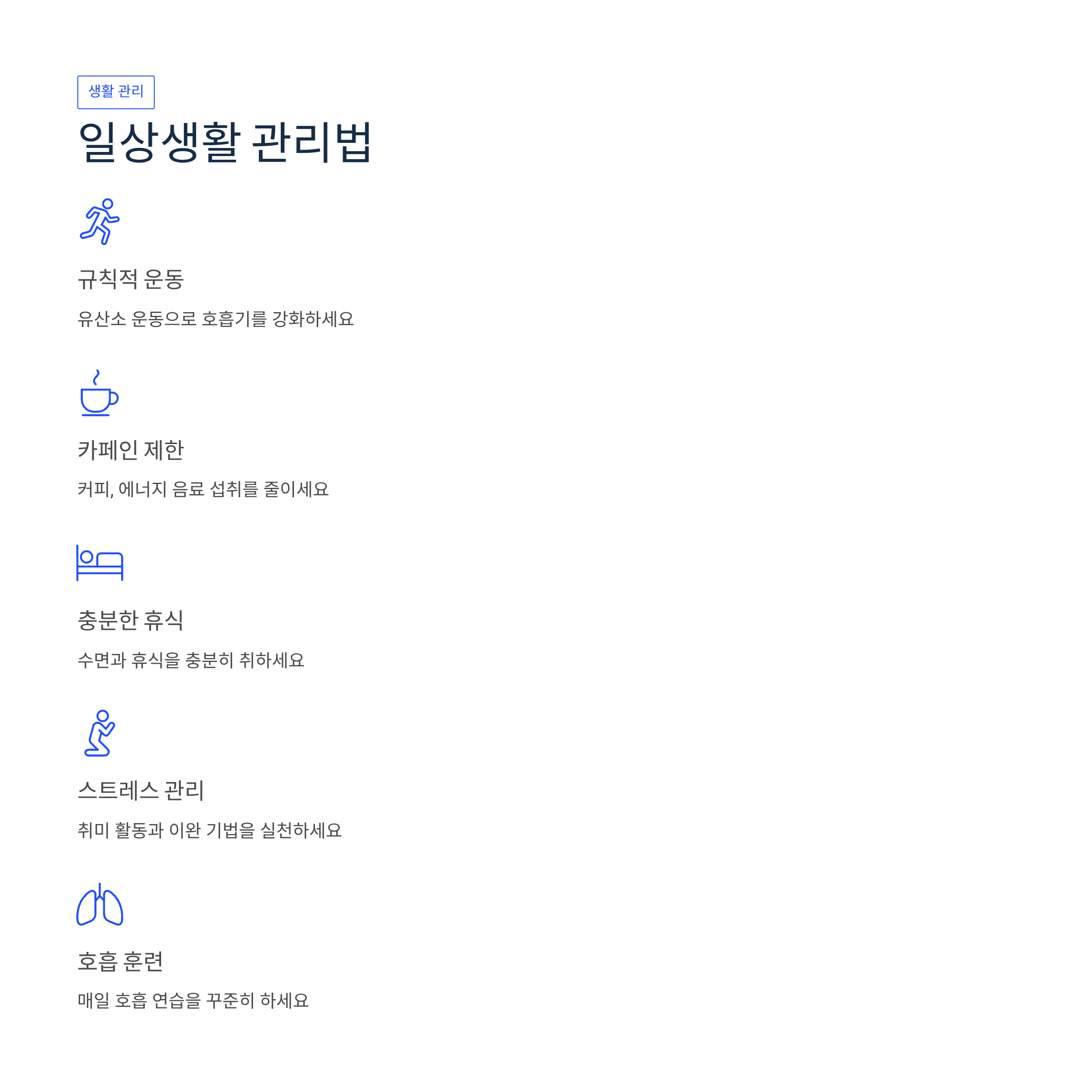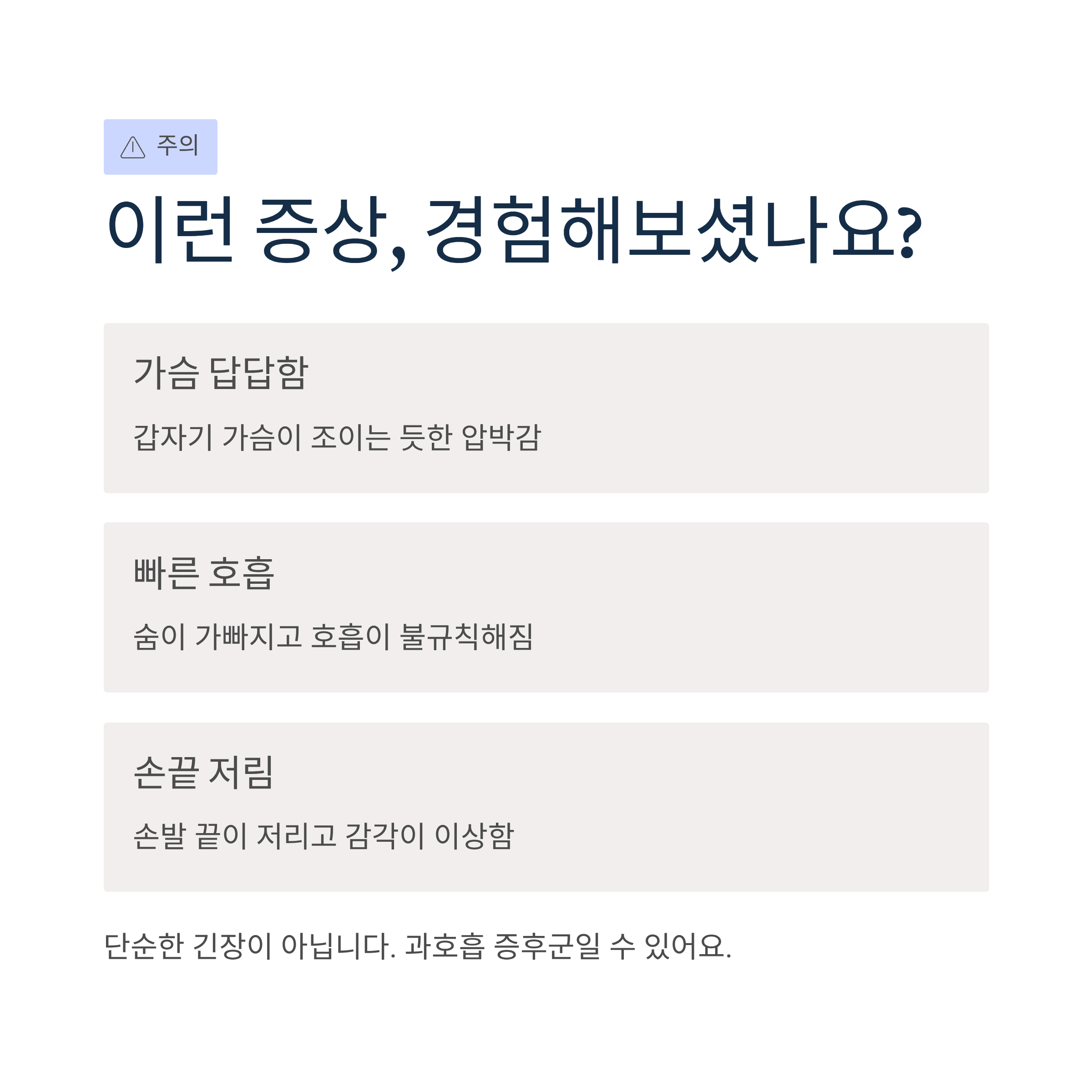 과호흡 증후군은 적절한 대처와 생활 관리로 충분히 개선할 수 있는 질환입니다. 증상이 나타났을 때 당황하지 말고 천천히 호흡을 조절하는 것이 가장 중요하며, 재발 방지를 위한 스트레스 관리도 병행해야 합니다.