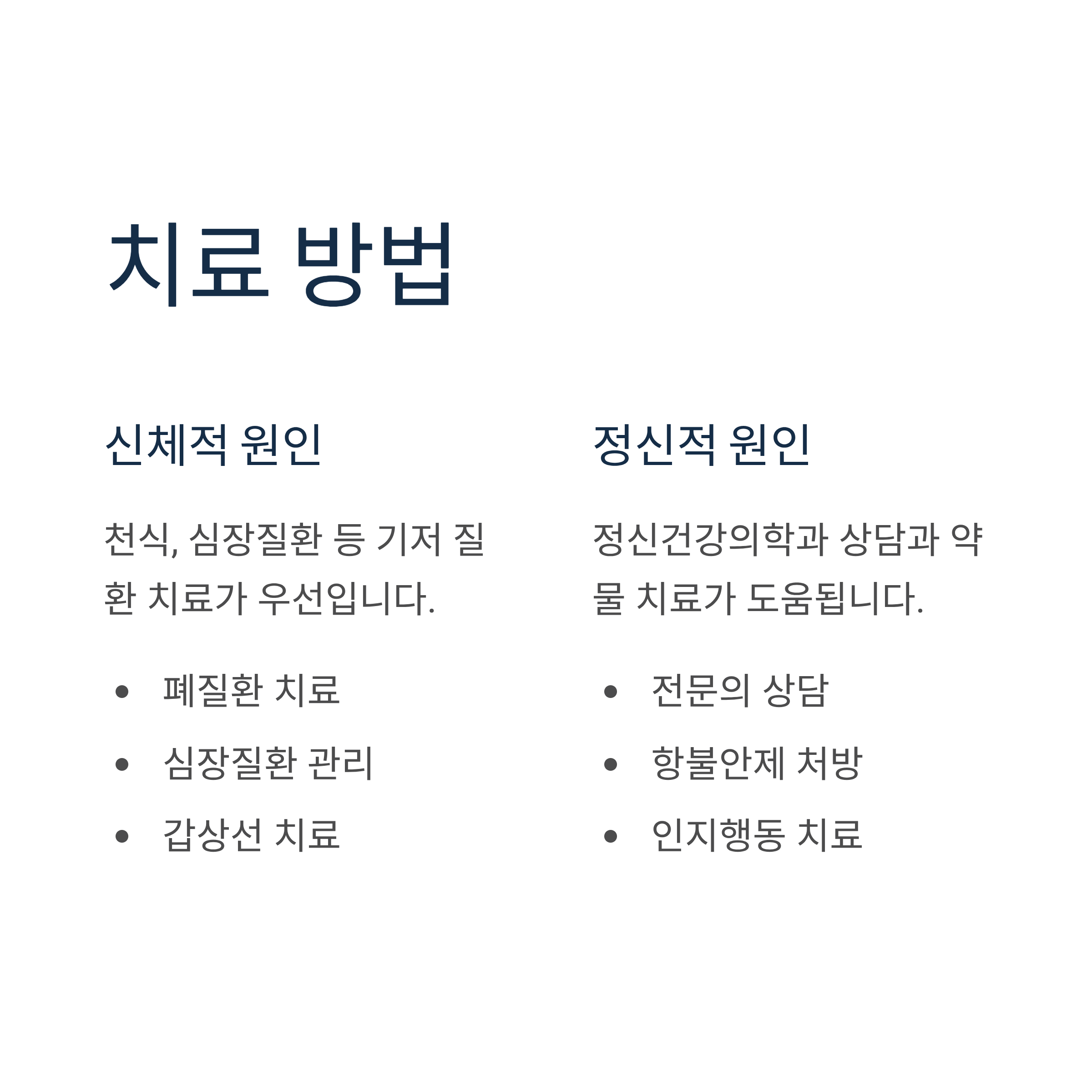 증상이 반복되거나 일상생활에 지장이 있다면 동맥혈 가스분석 검사를 통해 정확한 진단을 받아야 합니다. 신체적 질환이 원인인 경우 해당 질환 치료가 우선이며, 정신적 원인인 경우 정신건강의학과 상담과 필요시 항불안제 처방이 도움이 될 수 있습니다.