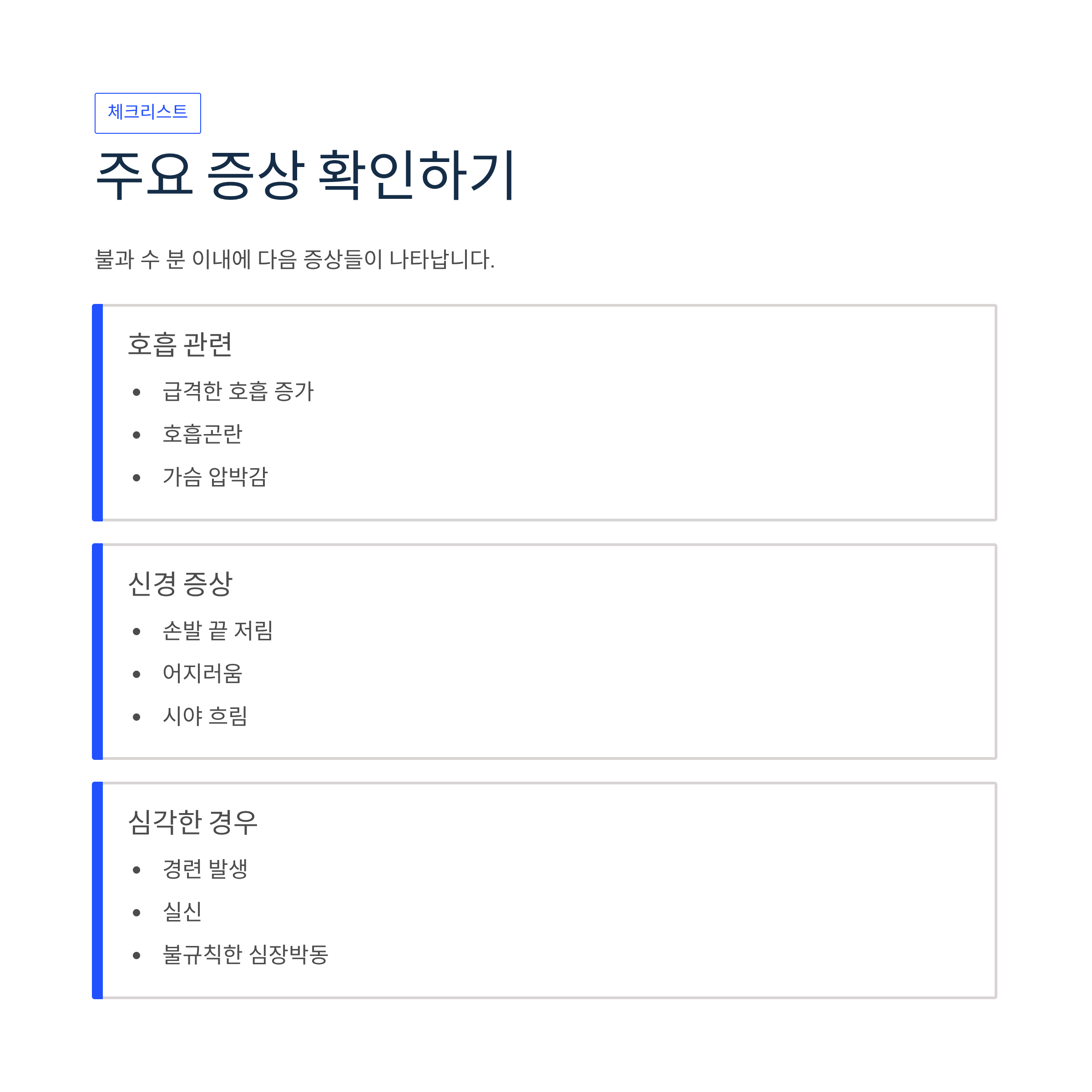 불과 수 분 이내에 호흡이 빨라지고 적은 양의 호흡이 매우 힘들게 이루어지며, 어지러움, 시력 장애, 의식 저하가 동반됩니다. 구체적인 증상은 다음과 같습니다.