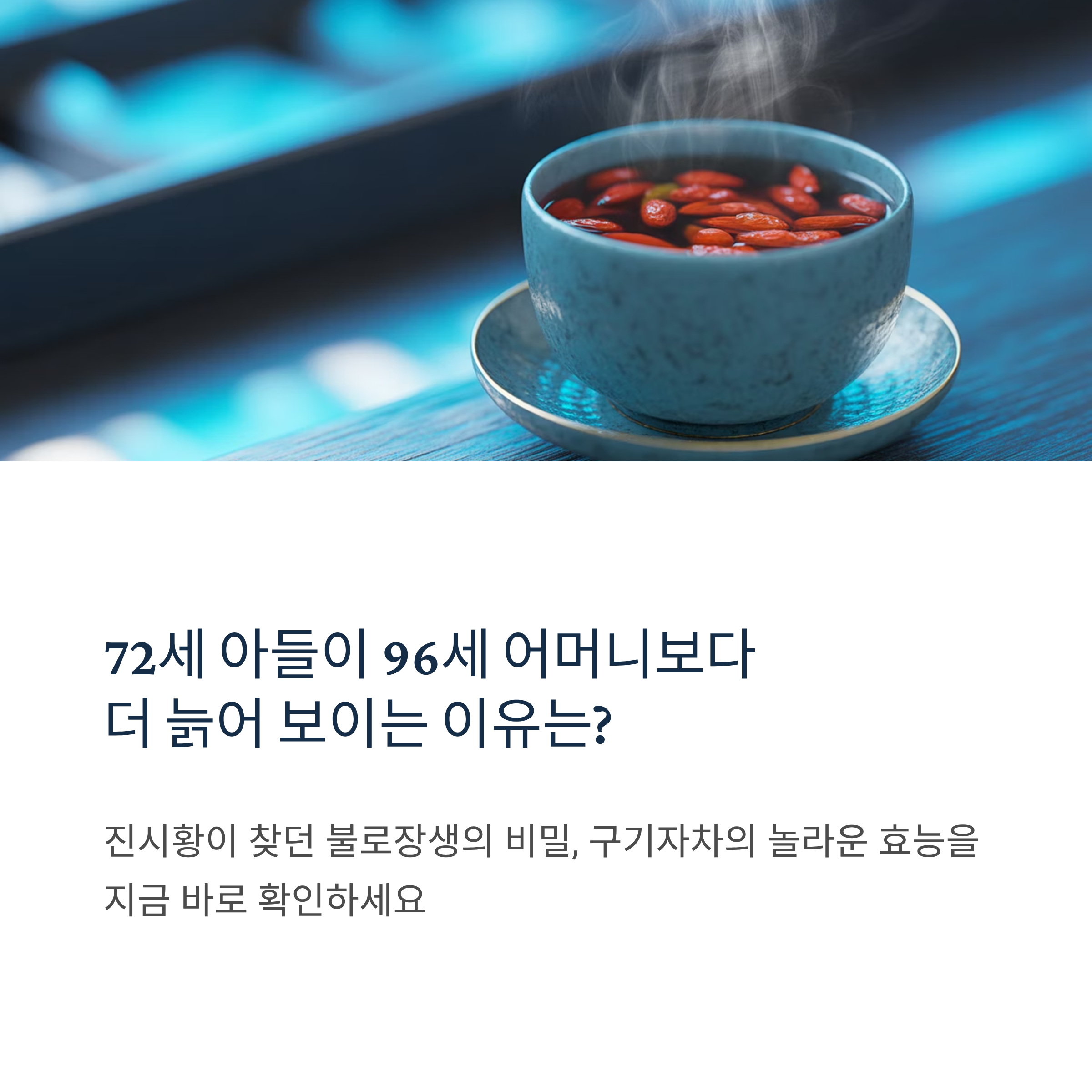 "72세 아들이 96세 어머니보다 더 늙어 보이는 이유는?" 동의보감에 전해지는 구기자 설화 속 이 충격적인 이야기는 구기자차 효능을 극적으로 보여줍니다. 진시황이 불로장생을 위해 찾았던 3대 명약 구기자, 지금 이 순간에도 당신의 건강을 지켜줄 수 있습니다.