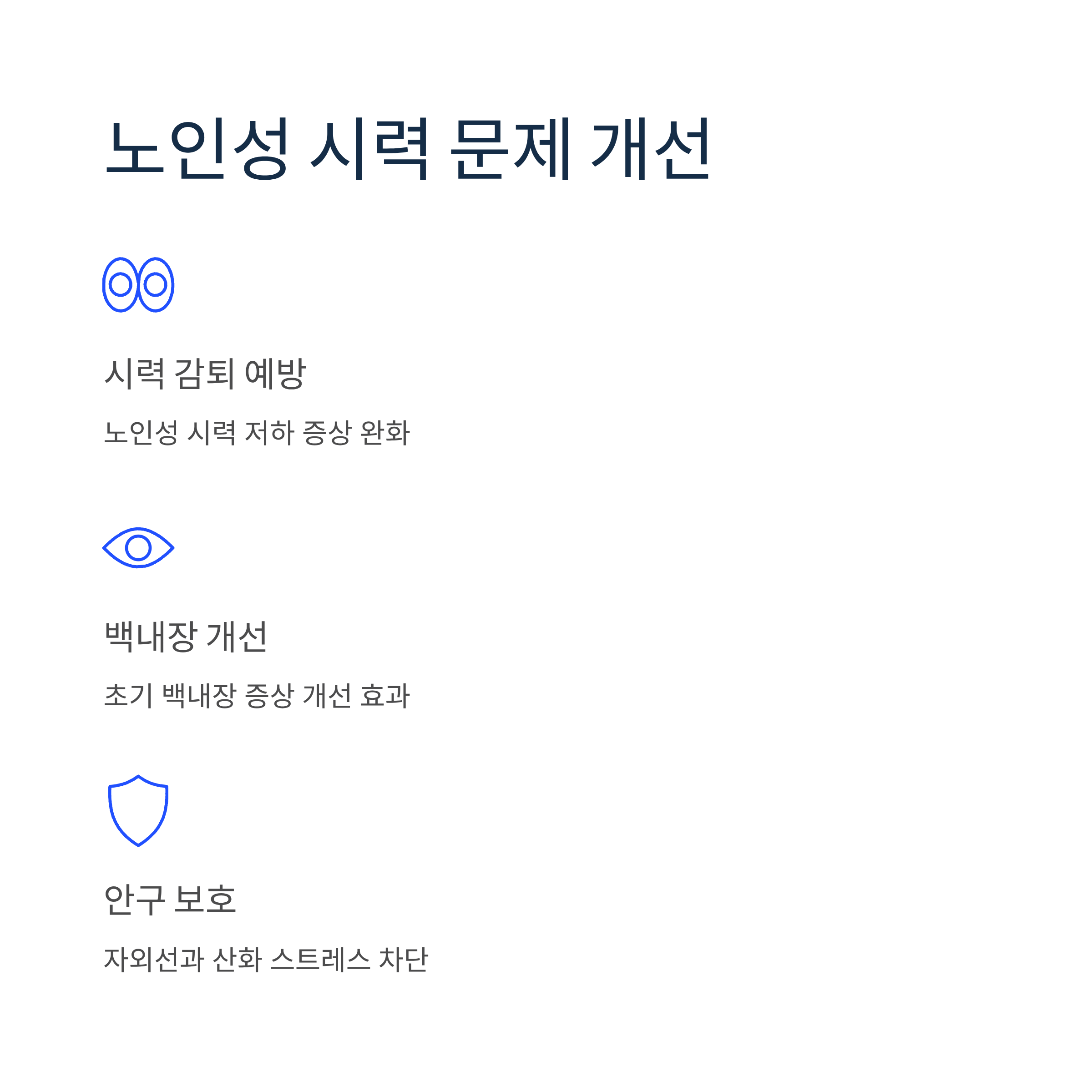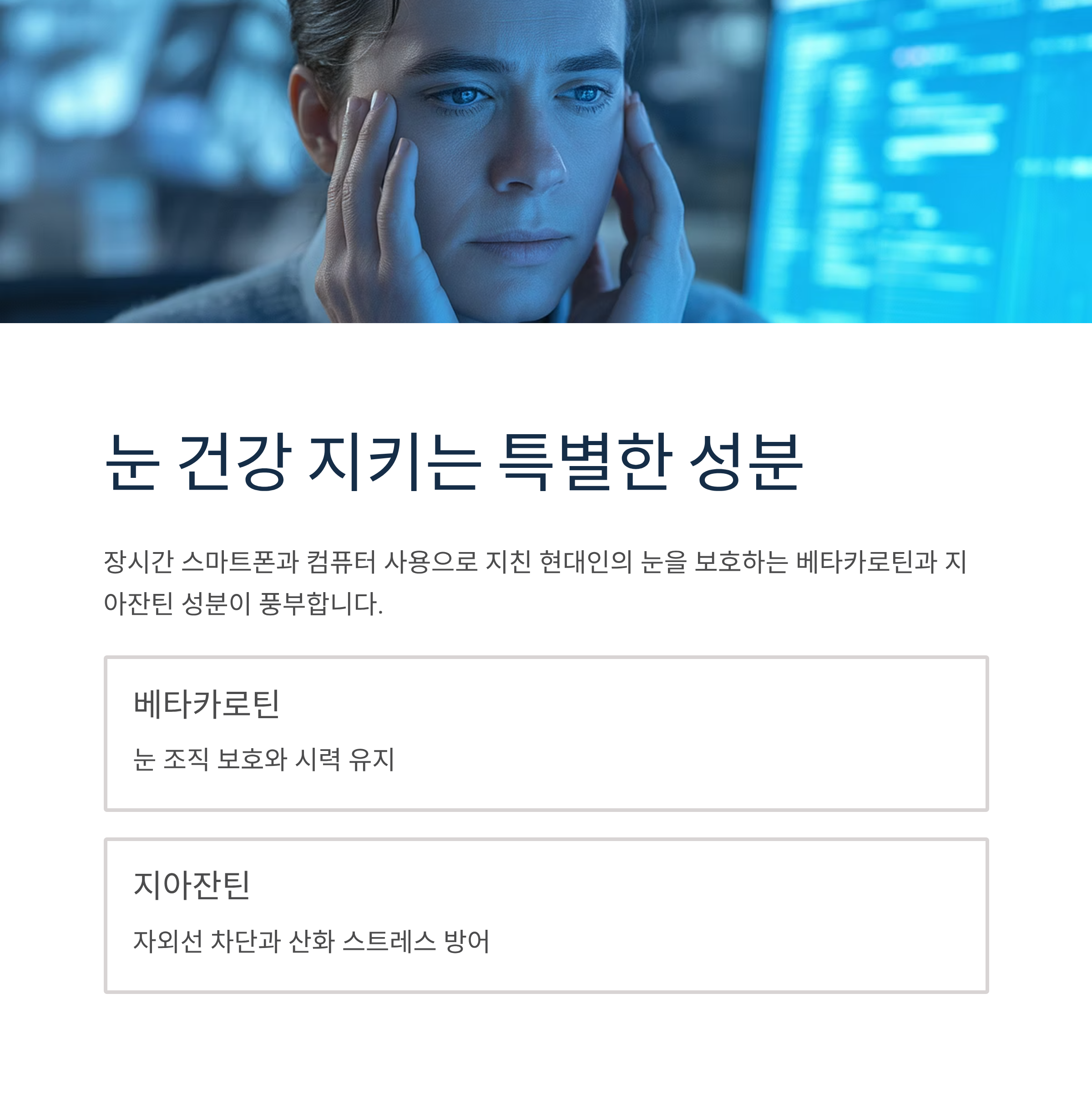 장시간 디지털 기기 사용으로 인한 눈의 피로와 건조함을 완화하고, 시력 보호에 도움을 줍니다. 베타카로틴이 당근보다 많이 함유되어 있어 눈 조직 형성에 기여합니다.
