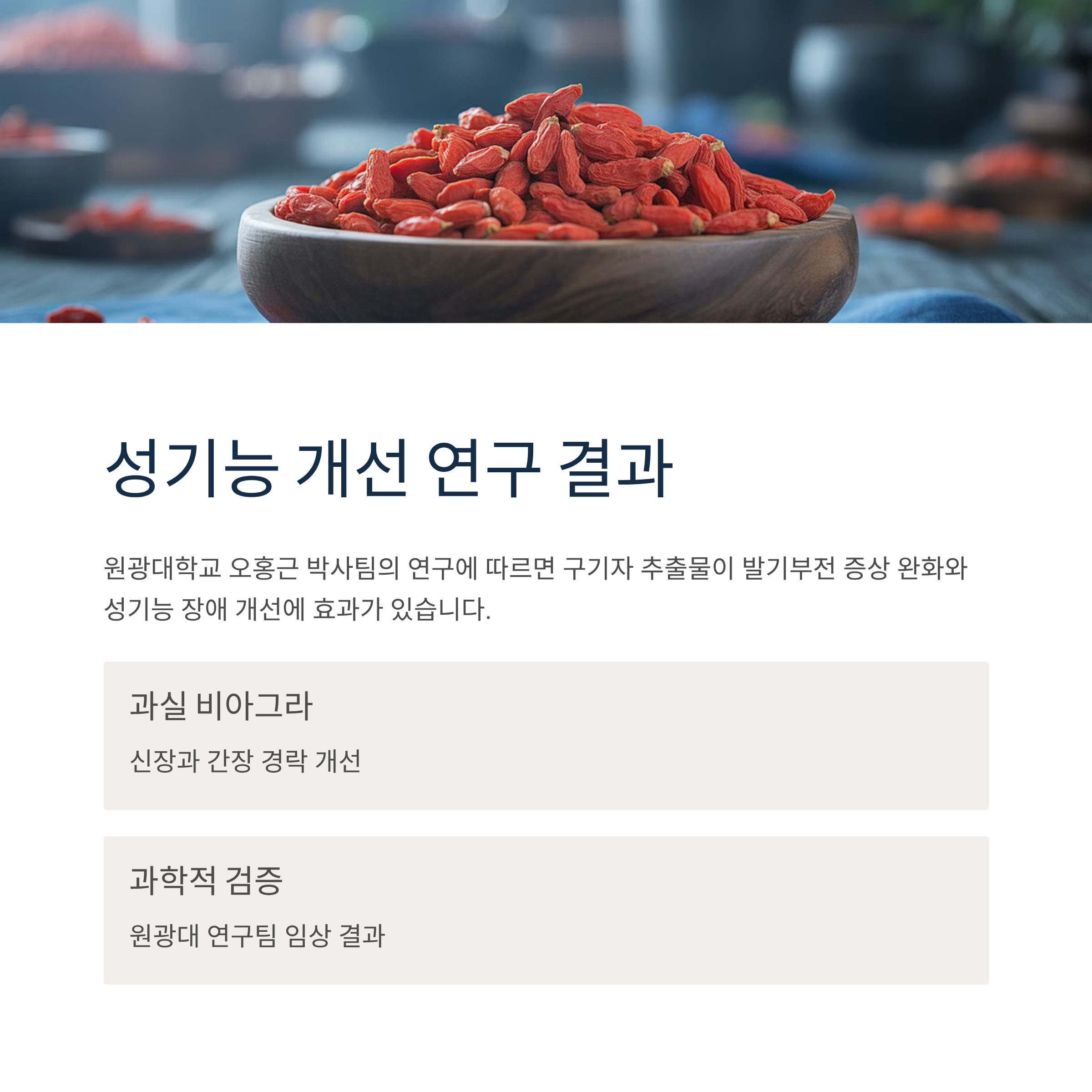 원광대학교 생명과학자원대 오홍근 박사팀의 연구에 따르면, 구기자 추출물이 발기부전 증상 완화와 성기능 장애 개선에 효과가 있는 것으로 나타났습니다. 신장과 간장 경락을 좋게 하여 '과실 비아그라'로도 불립니다.