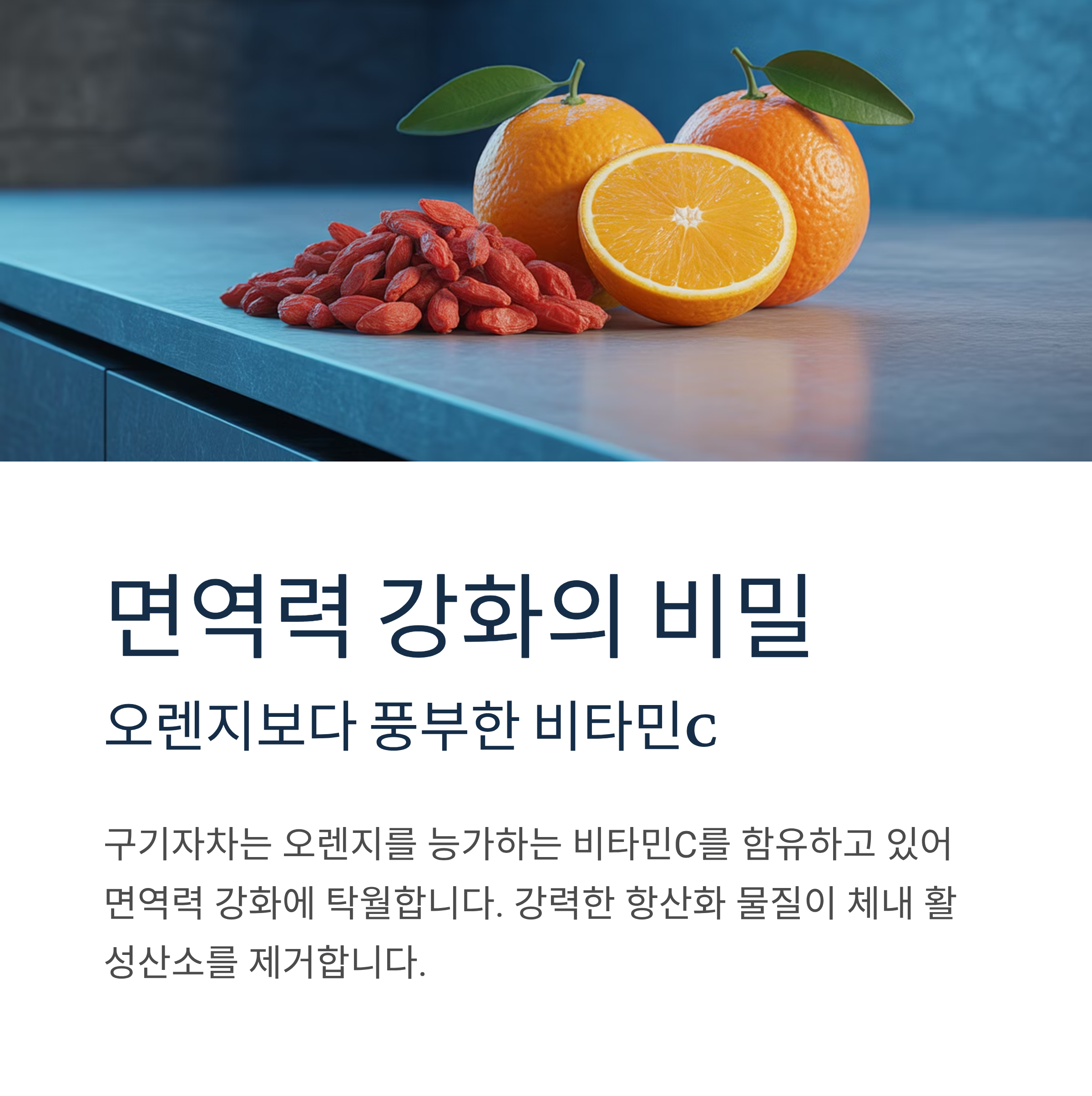구기자차는 오렌지보다 풍부한 비타민C를 함유하고 있어 면역력 강화에 탁월합니다. 강력한 항산화 물질이 체내 활성산소를 제거해 세포 노화를 억제하며, 감기와 같은 질병 예방에 효과적입니다. 특히 환절기 면역력이 떨어지기 쉬운 시기에 하루 2~3잔의 구기자차를 꾸준히 마시면 몸의 저항력을 높일 수 있습니다.