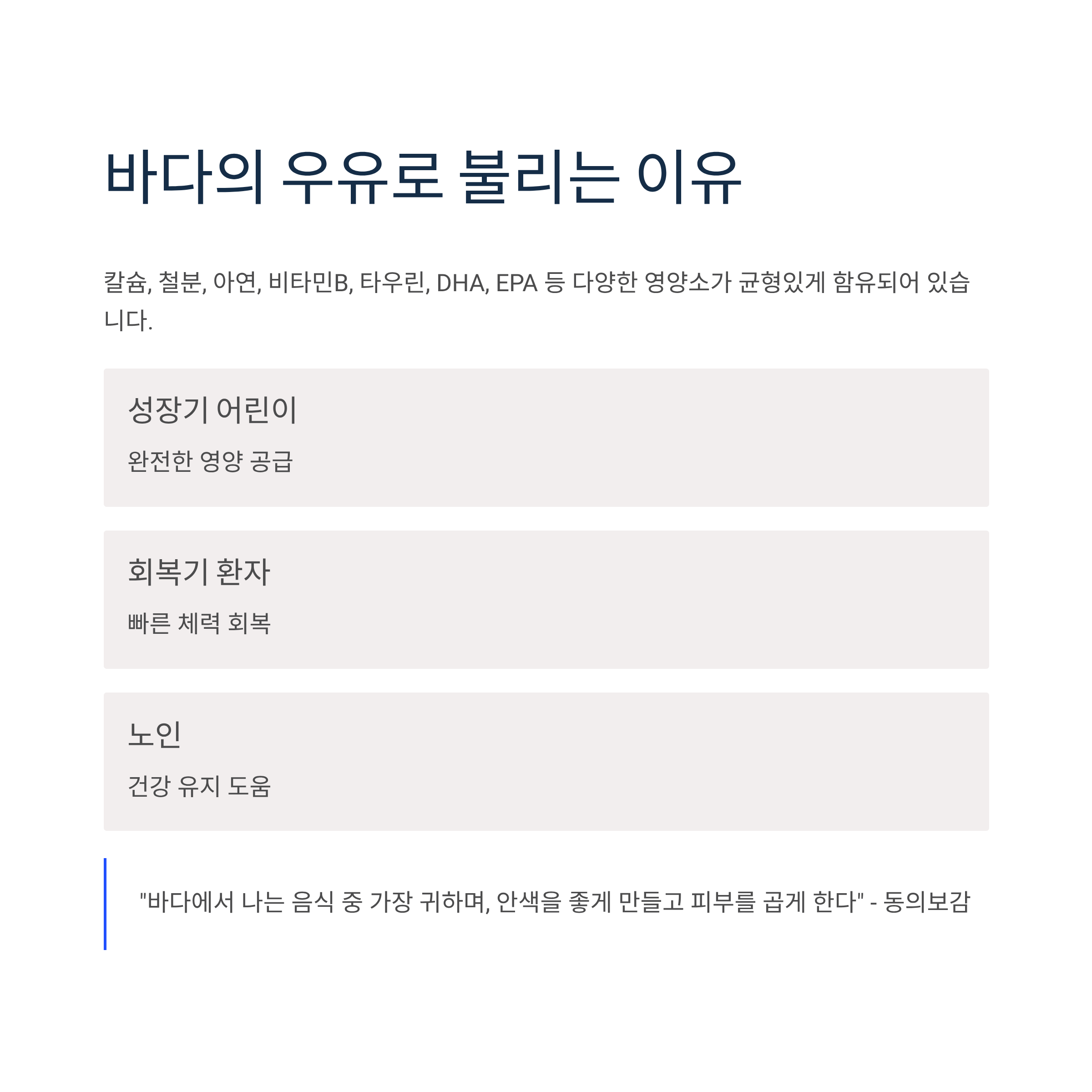 동의보감: "바다에서 나는 음식 중 가장 귀하며, 안색을 좋게 만들고 피부를 곱게 한다"