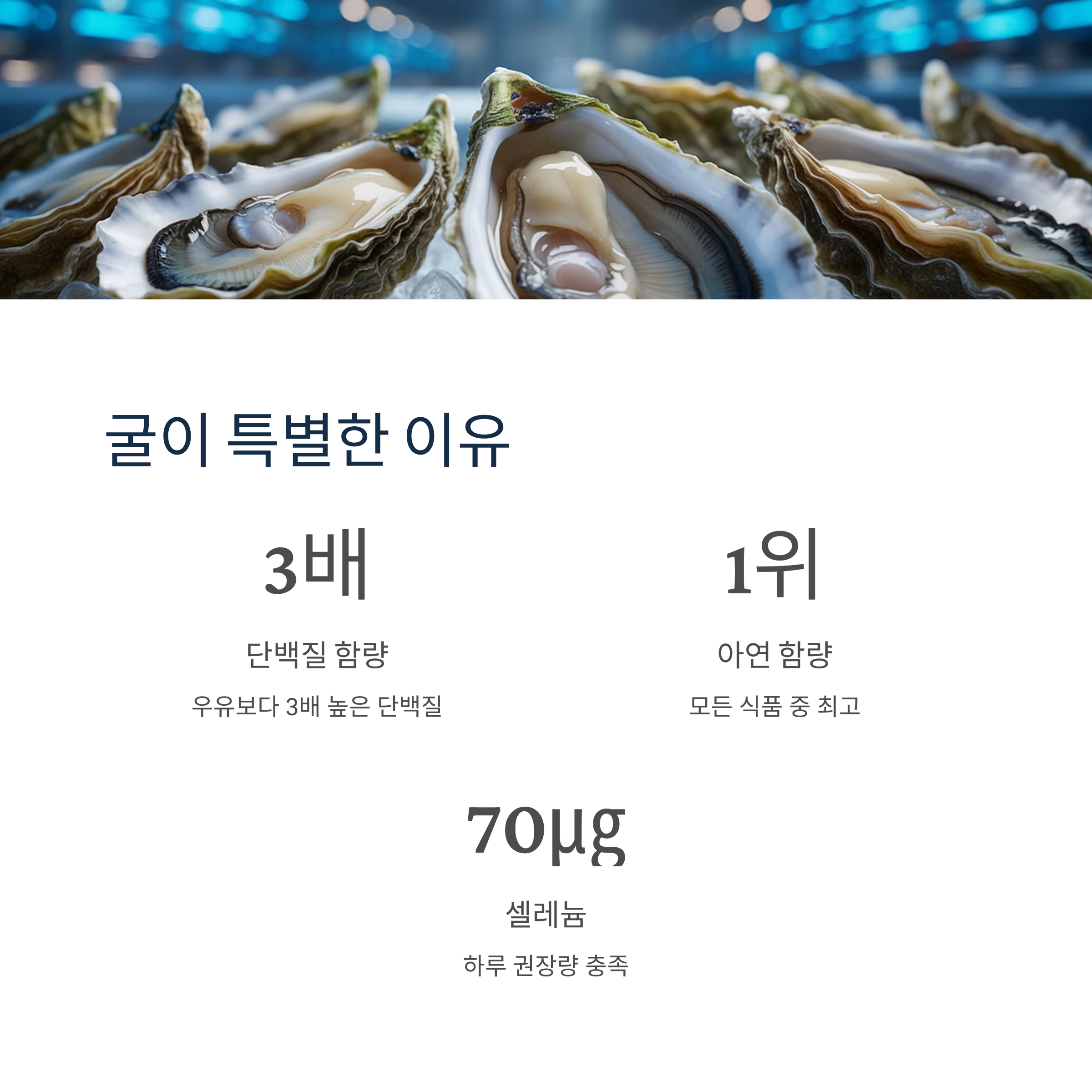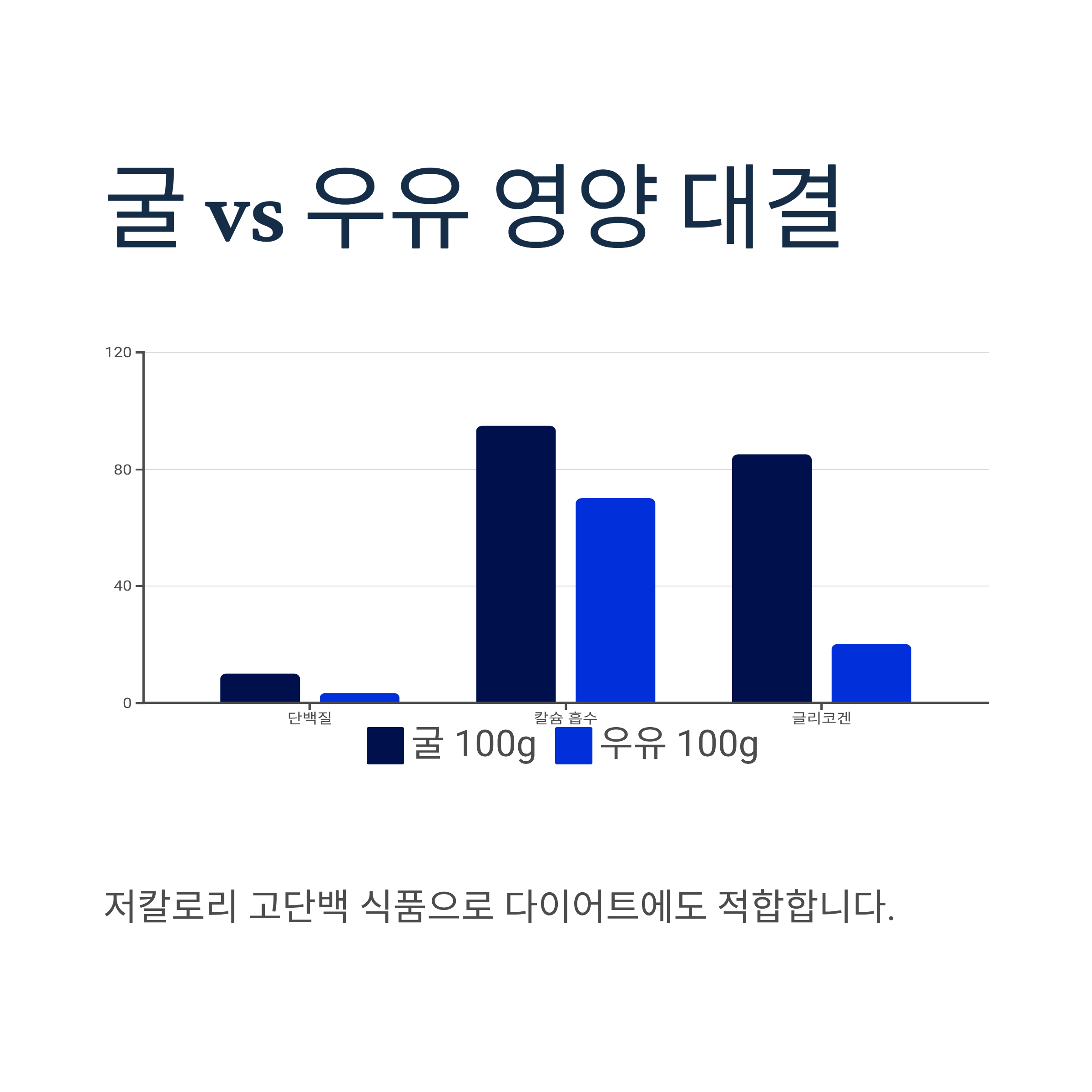 단백질 함량: 굴이 우유보다 3배 높음 (굴 약 10% vs 우유 약 3%)