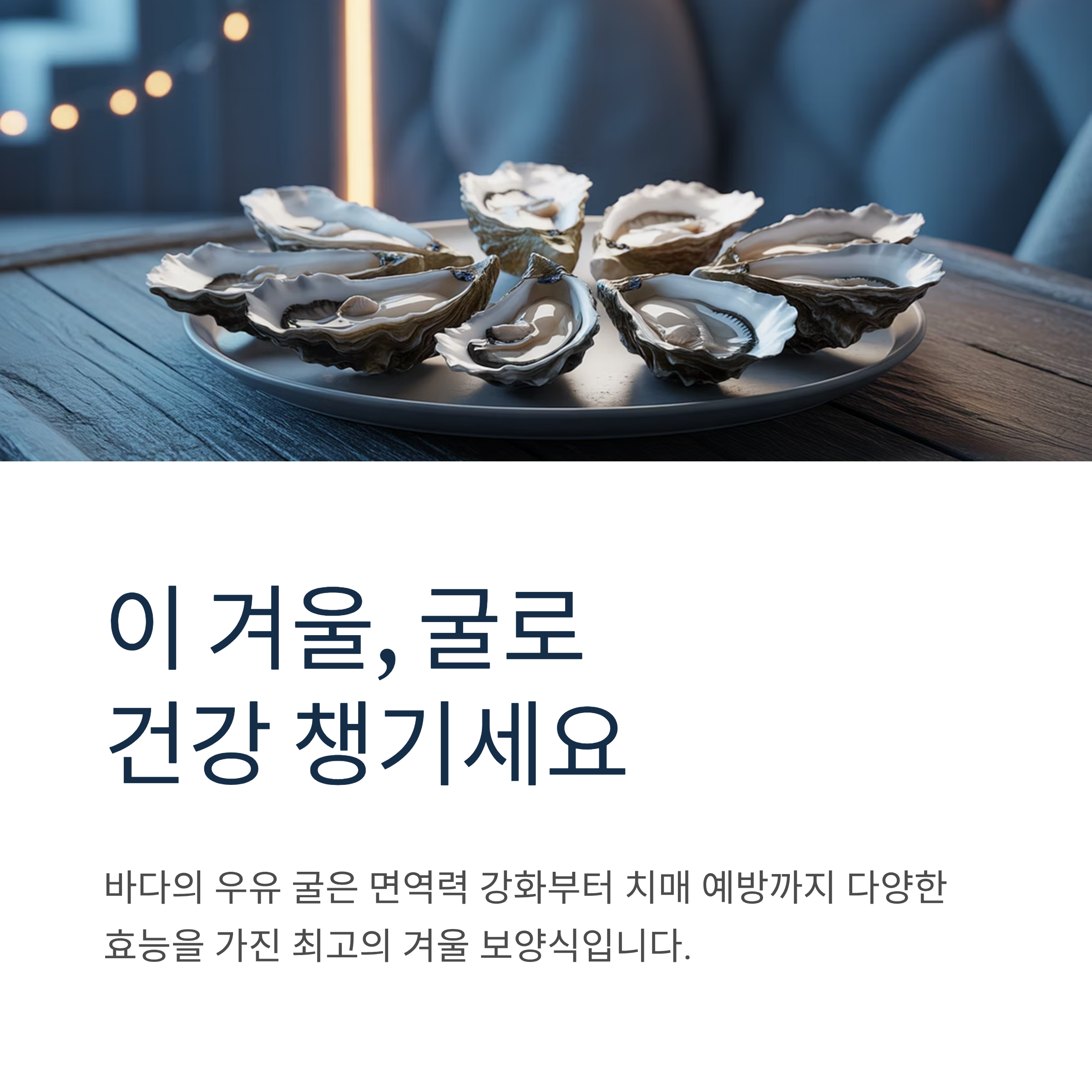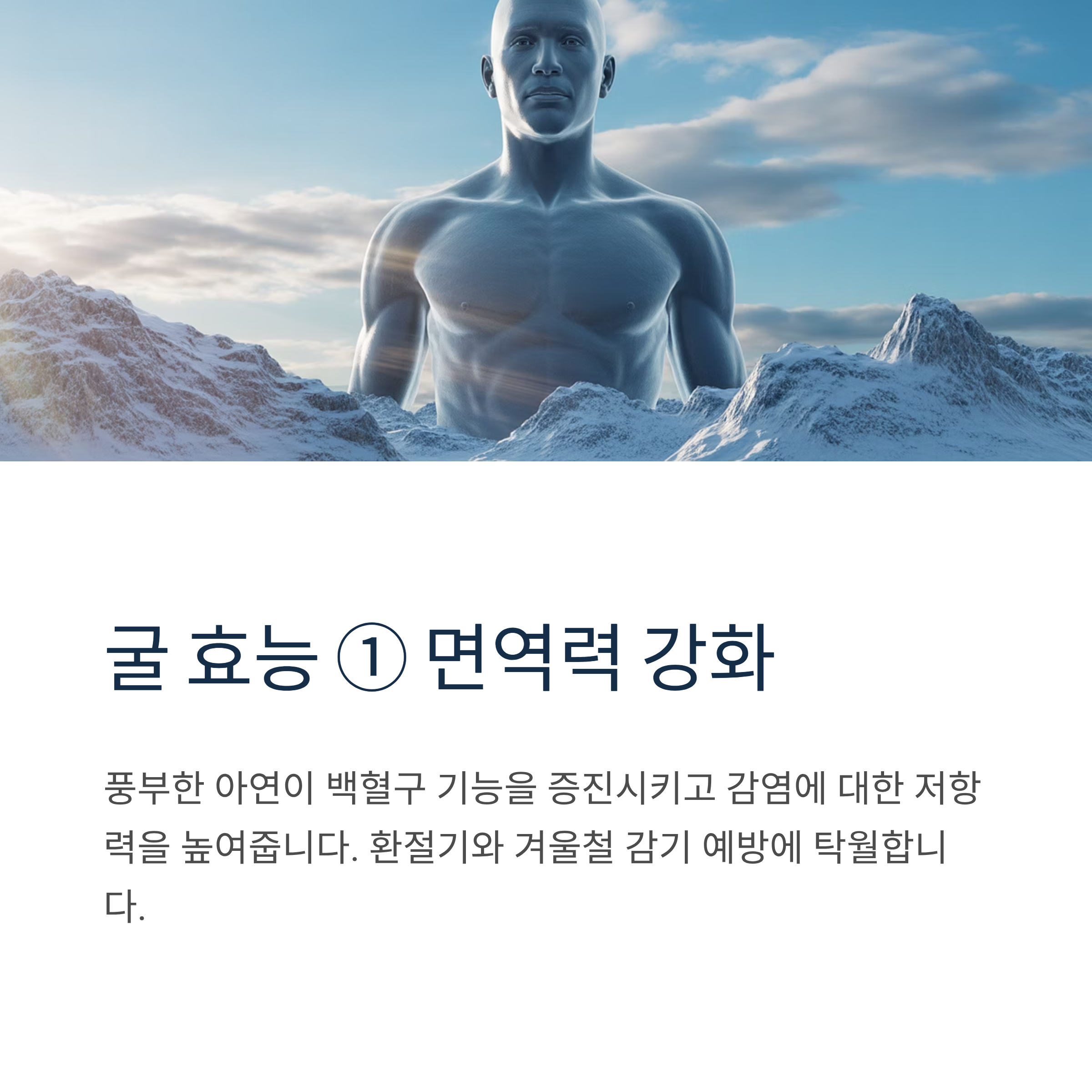 굴에 풍부한 아연은 백혈구 기능을 증진시키고 감염에 대한 저항력을 높여줍니다. 특히 환절기나 겨울철 감기 예방에 탁월합니다.