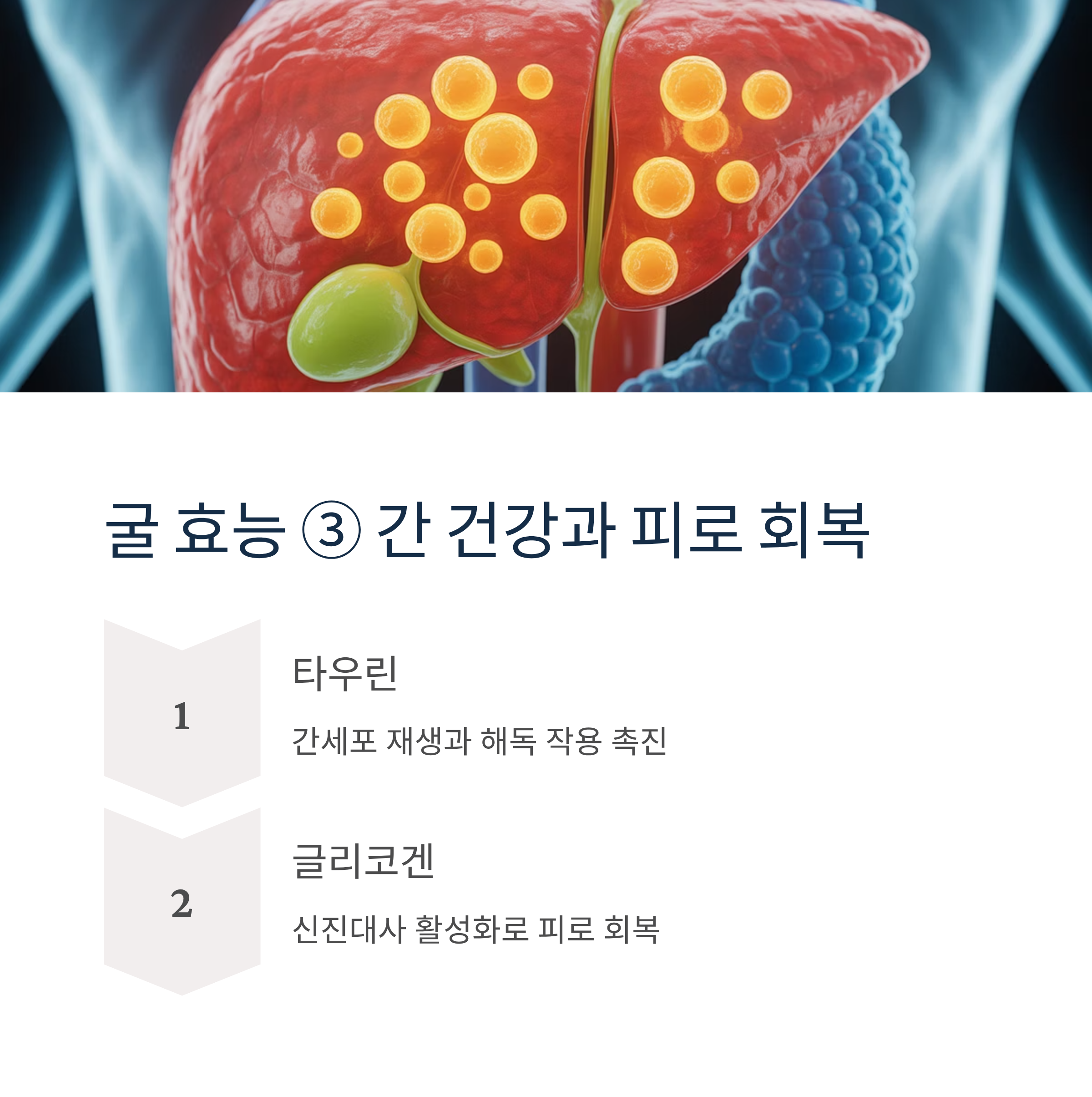 타우린 성분이 간세포 재생을 돕고 해독 작용을 촉진하며, 글리코겐은 신진대사를 활성화해 피로 회복에 도움을 줍니다.