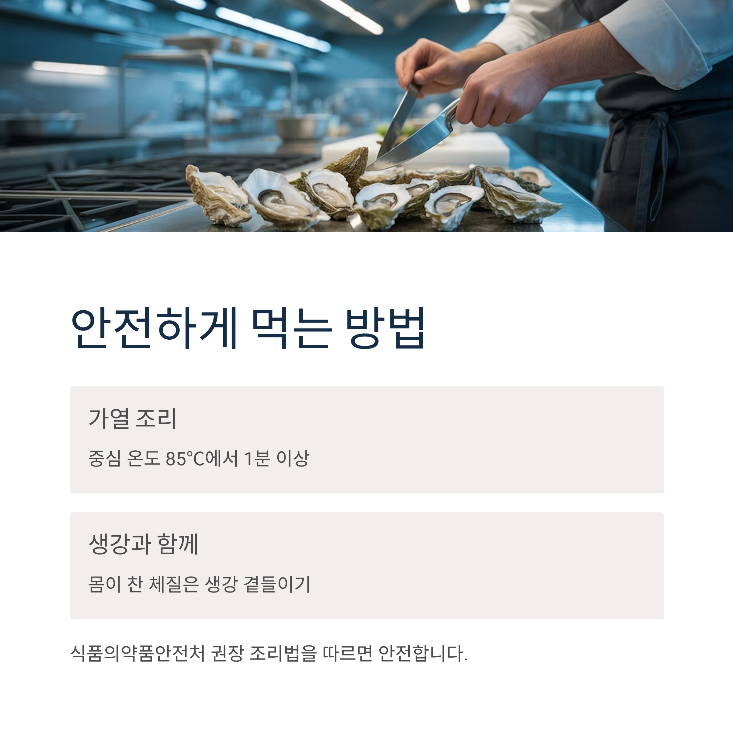 생굴은 노로바이러스나 비브리오균 감염 위험이 있어 노약자는 반드시 가열 조리해 섭취해야 합니다. 식품의약품안전처는 굴의 중심 온도를 85℃에서 1분 이상 가열할 것을 권장합니다.