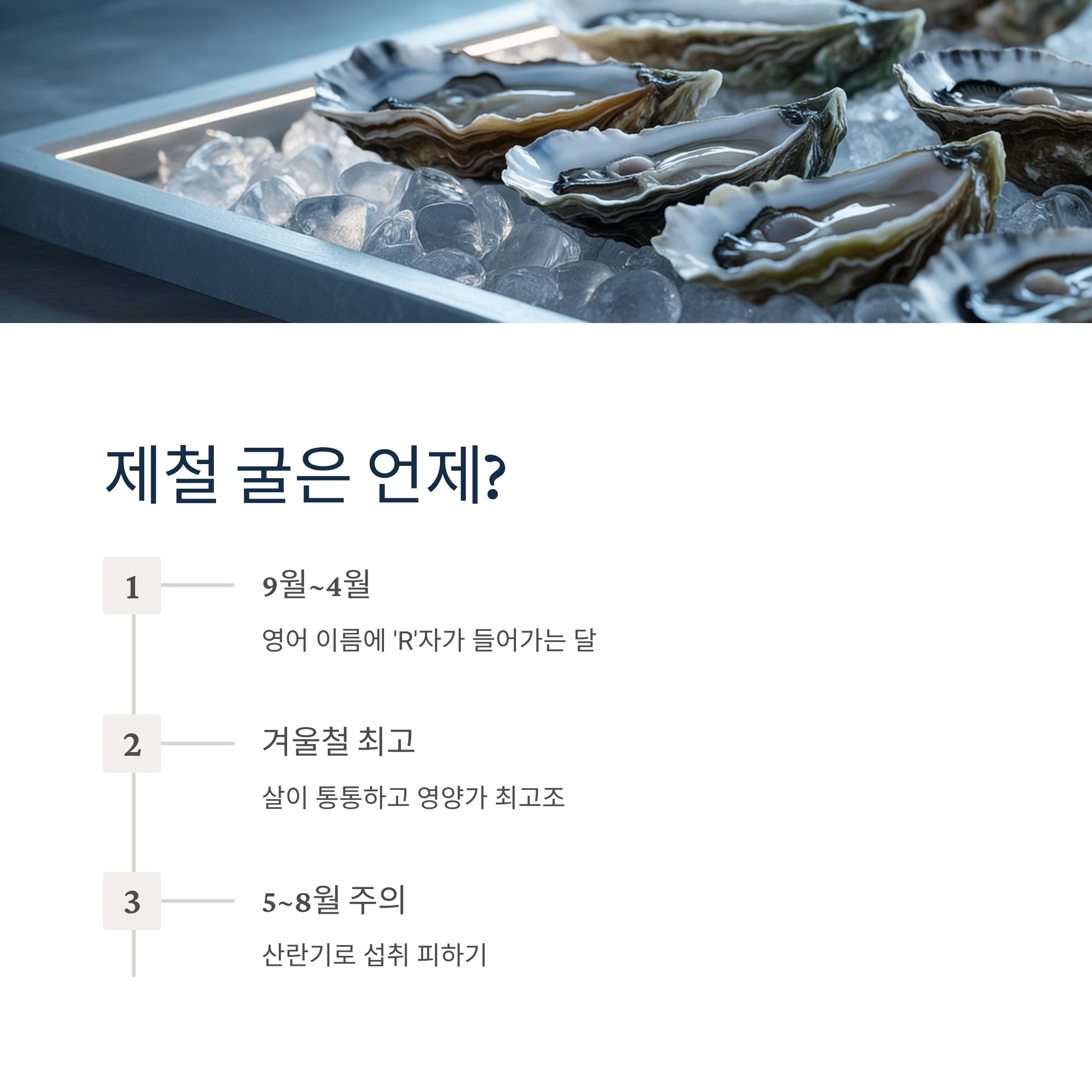 이 시기에는 성숙도가 높아 고소한 맛과 영양 성분이 최고조에 달합니다. 특히 겨울철 굴은 바다 플랑크톤을 풍부하게 섭취해 살이 통통하고 유백색 광택이 나며 영양가가 가장 풍부합니다. 5~8월은 산란기로 독성 물질 축적 가능성이 높아 섭취를 피하는 것이 좋습니다.