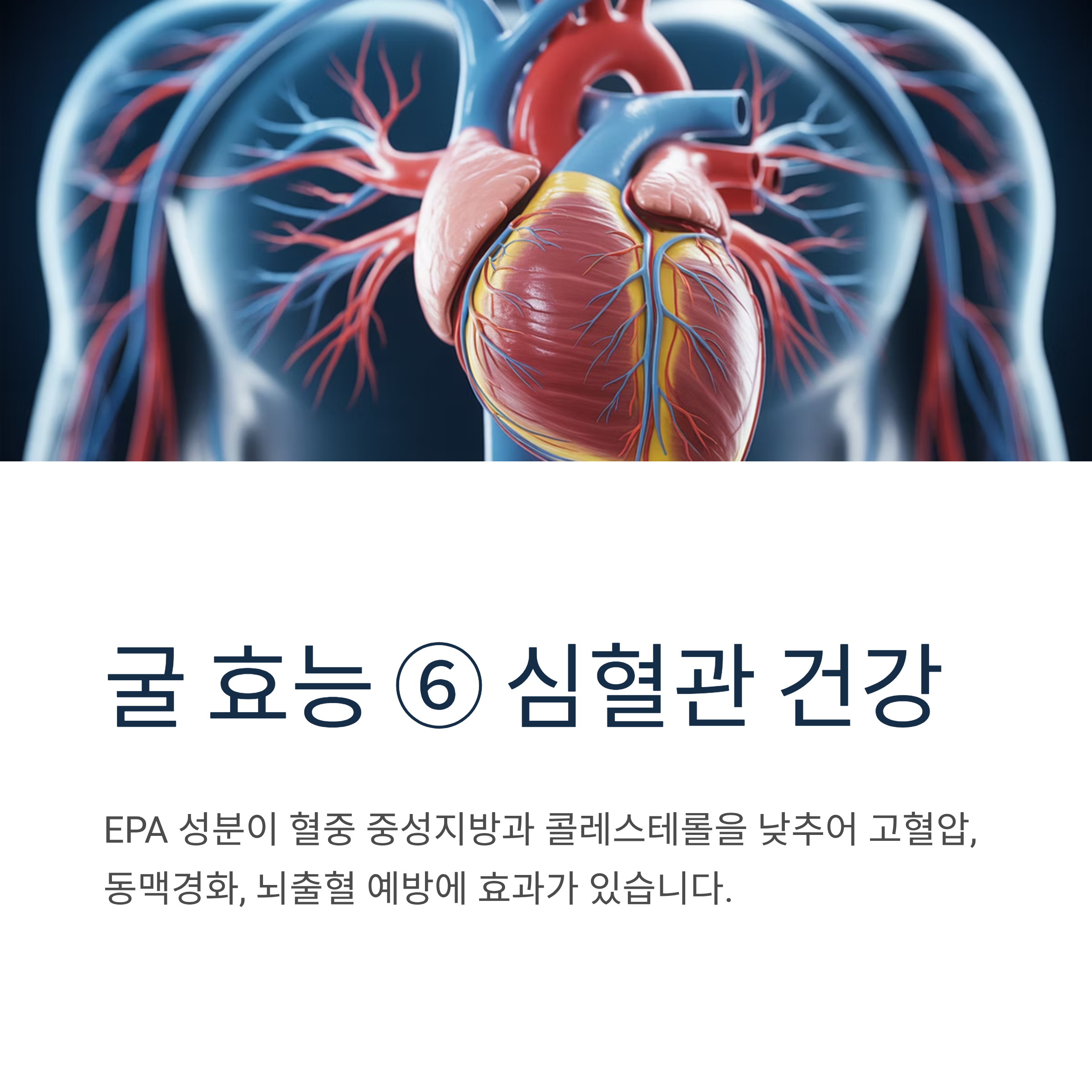 EPA 성분이 혈중 중성지방과 콜레스테롤을 낮추어 고혈압, 동맥경화, 뇌출혈 예방에 효과가 있습니다.