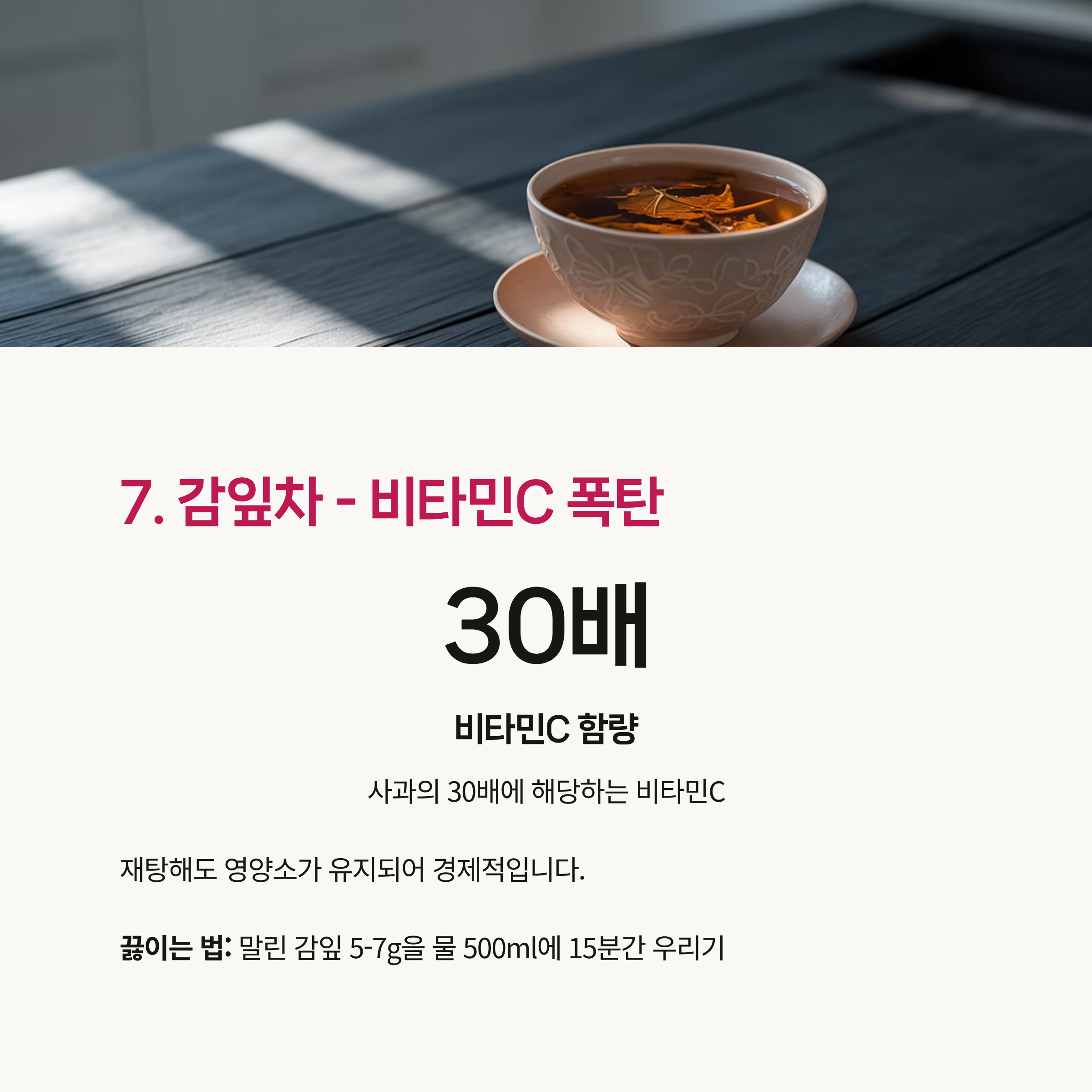 감잎에는 사과의 30배에 해당하는 비타민C가 들어있어 감기 예방 및 기침 완화에 뛰어납니다. 또한 재탕해도 영양소가 유지되어 경제적입니다.