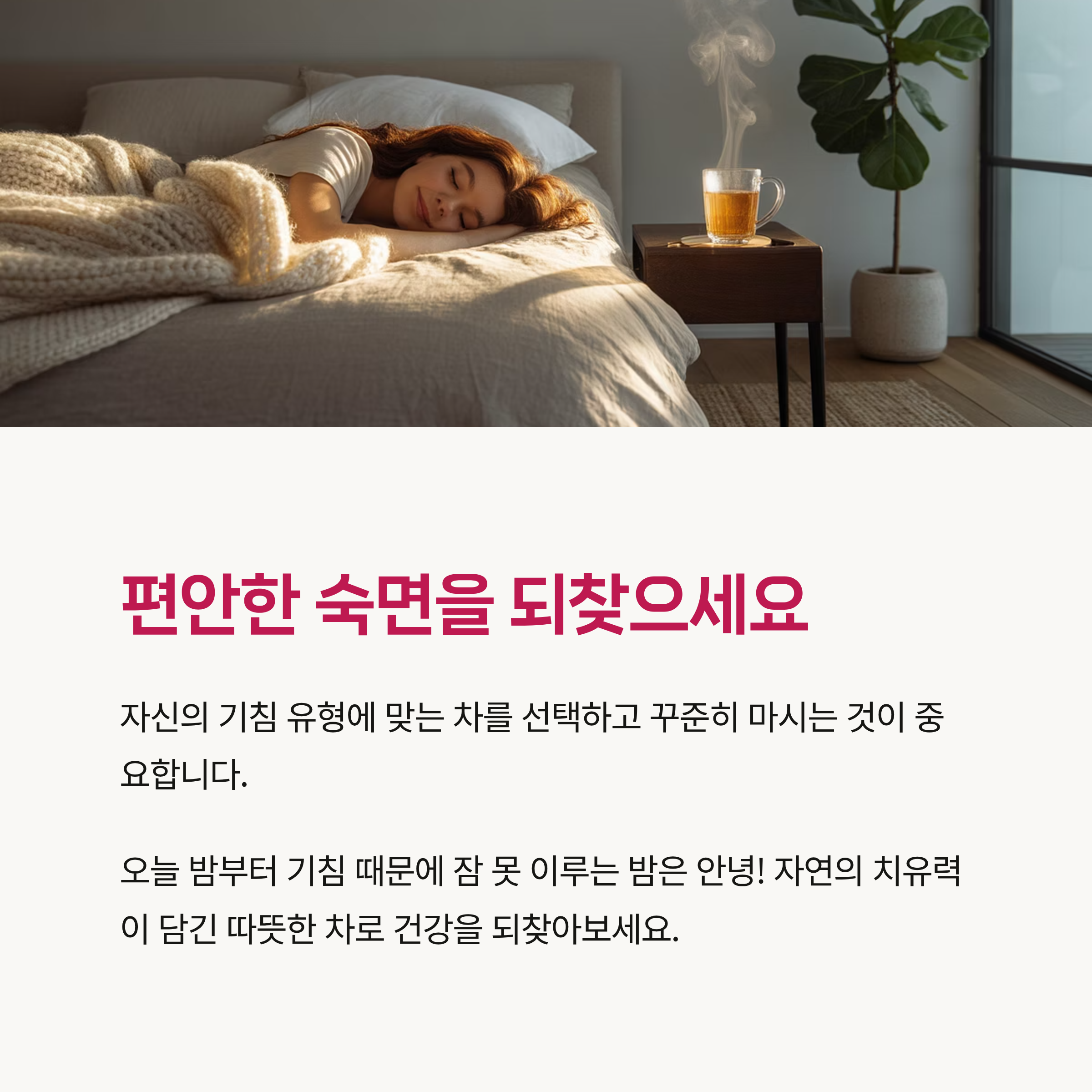 오늘 밤부터 기침 때문에 잠 못 이루는 밤은 이제 안녕! 자연의 치유력이 담긴 따뜻한 차 한 잔으로 편안한 숙면을 되찾아보세요.