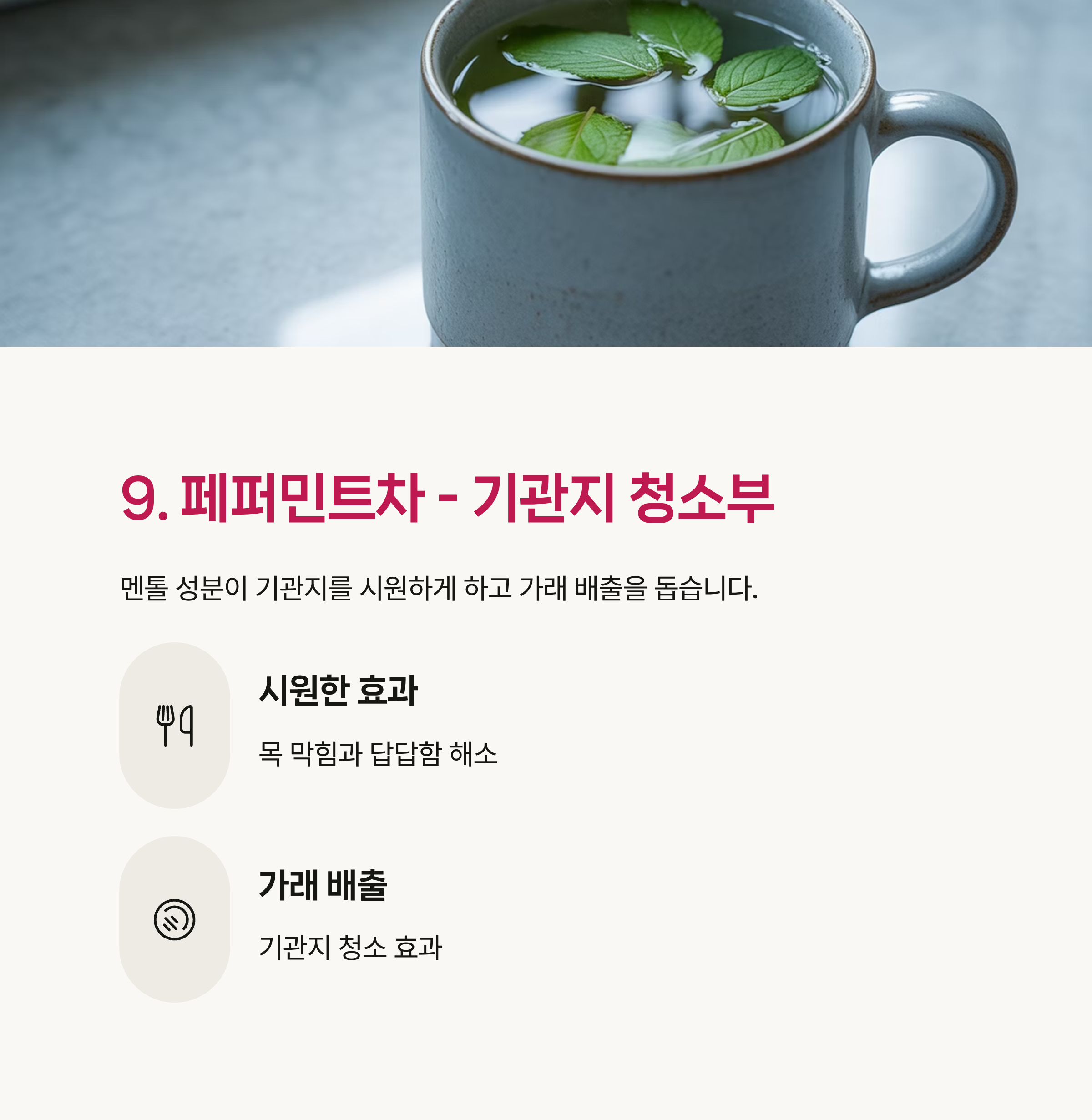 페퍼민트의 멘톨 성분이 기관지를 시원하게 해주고 가래 배출을 도와줍니다. 특히 목이 막히는 느낌이나 답답한 기침에 효과적입니다.