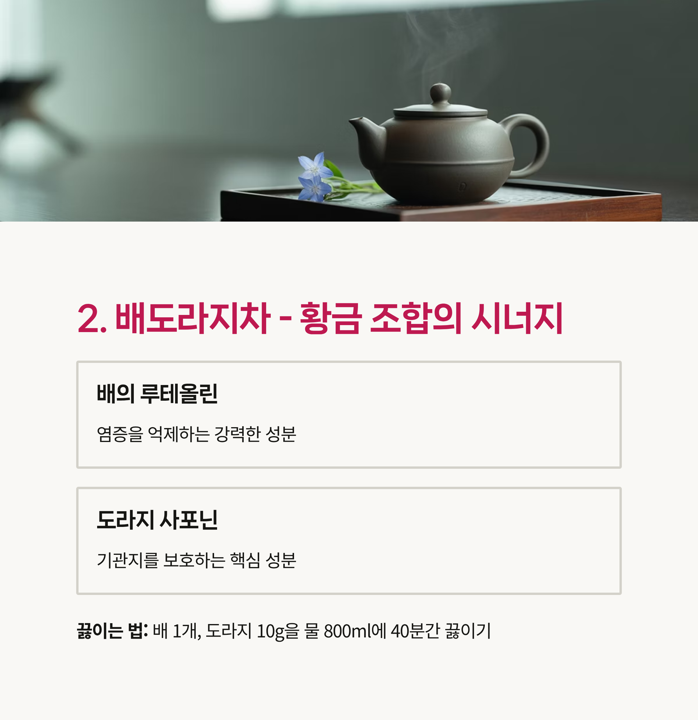 배와 도라지의 조합은 기침 완화에 최고의 시너지를 발휘합니다. 배의 루테올린 성분이 염증을 억제하고, 도라지의 사포닌이 기관지를 보호하여 마른기침과 가래기침 모두에 효과적입니다.