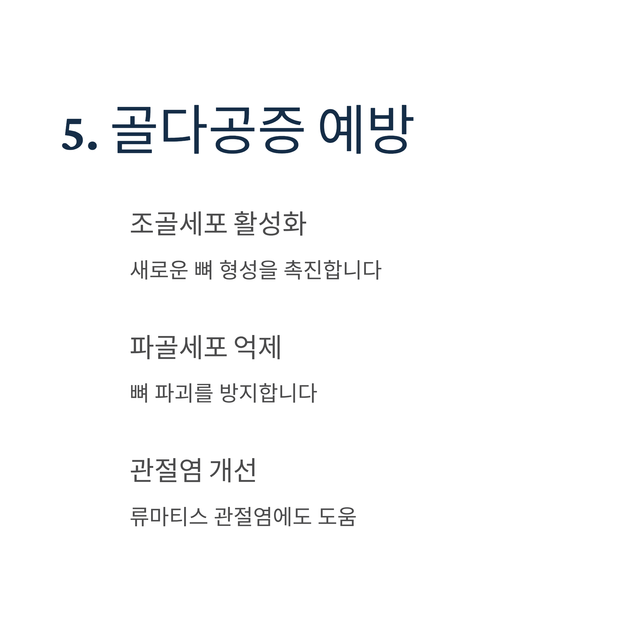 녹용의 칼슘과 콜라겐은 조골세포를 활성화하고 파골세포를 억제해 골다공증 예방에 효과적입니다. 또한 관절염과 류마티스 관절염 개선에도 도움을 줍니다.
