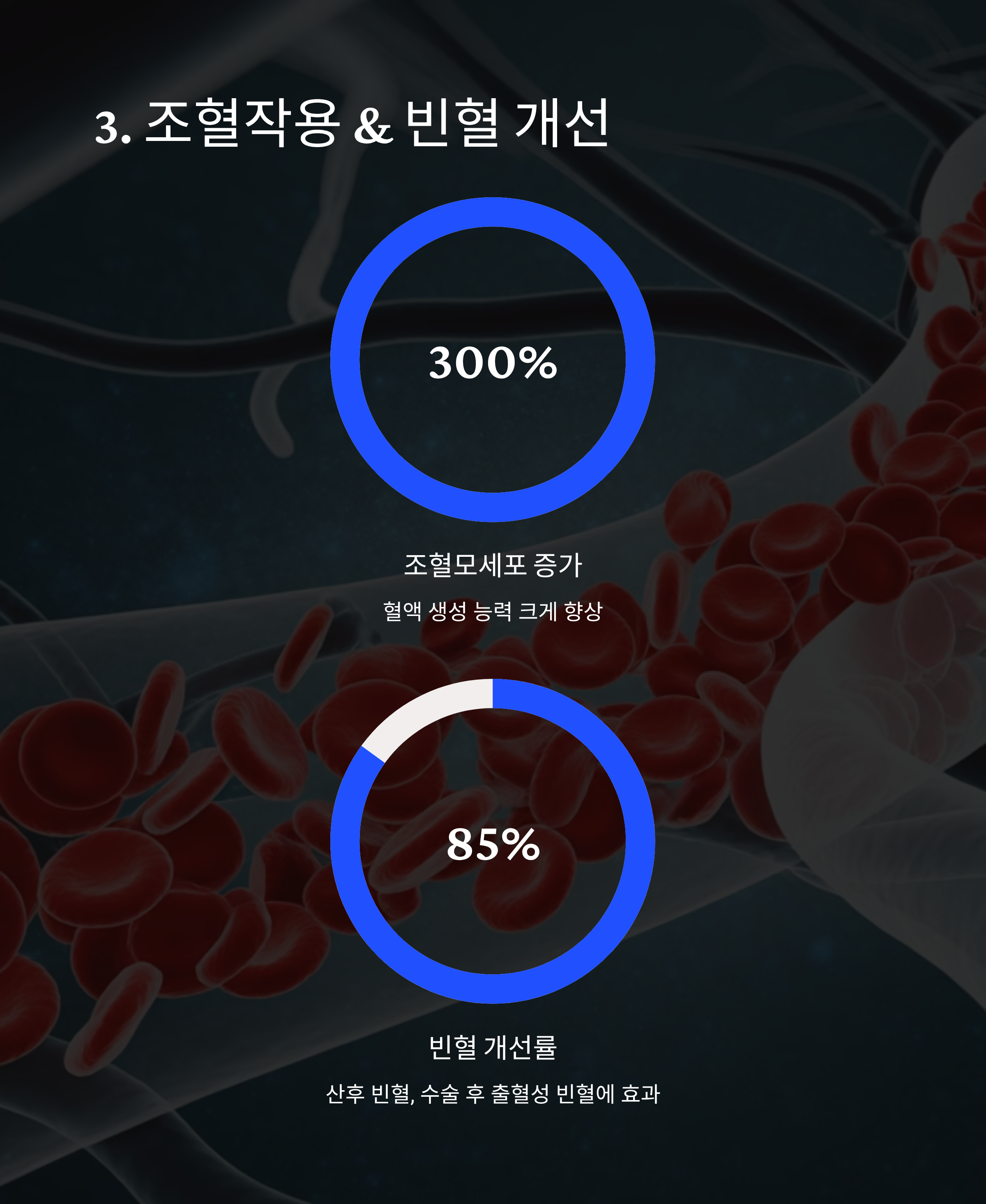 녹용은 조혈모세포 수를 크게 증가시켜 빈혈, 산후 빈혈, 수술 후 출혈성 빈혈 등에 뛰어난 치료 효과를 보입니다.