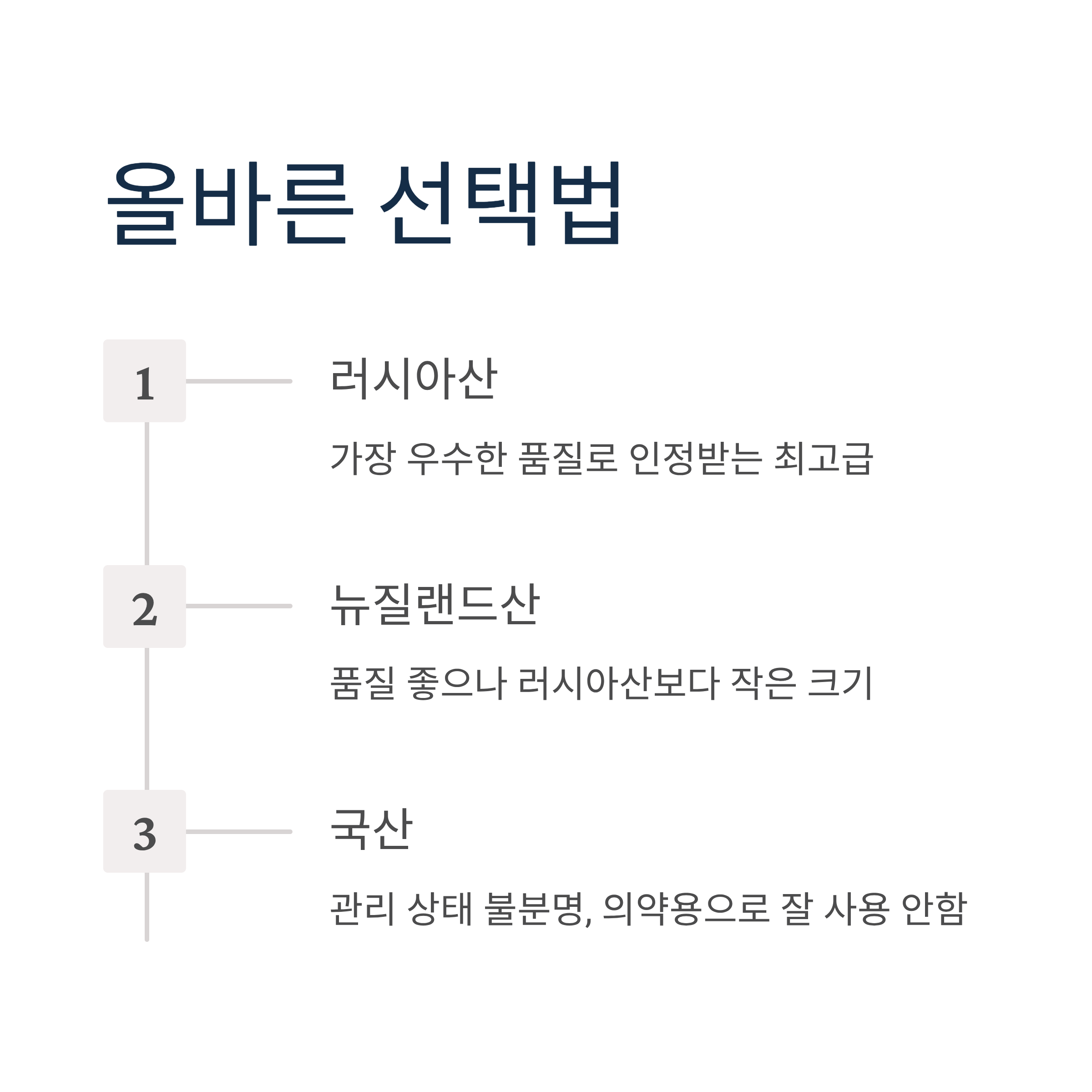 - 뉴질랜드산: 품질이 좋으나 러시아산보다 작음