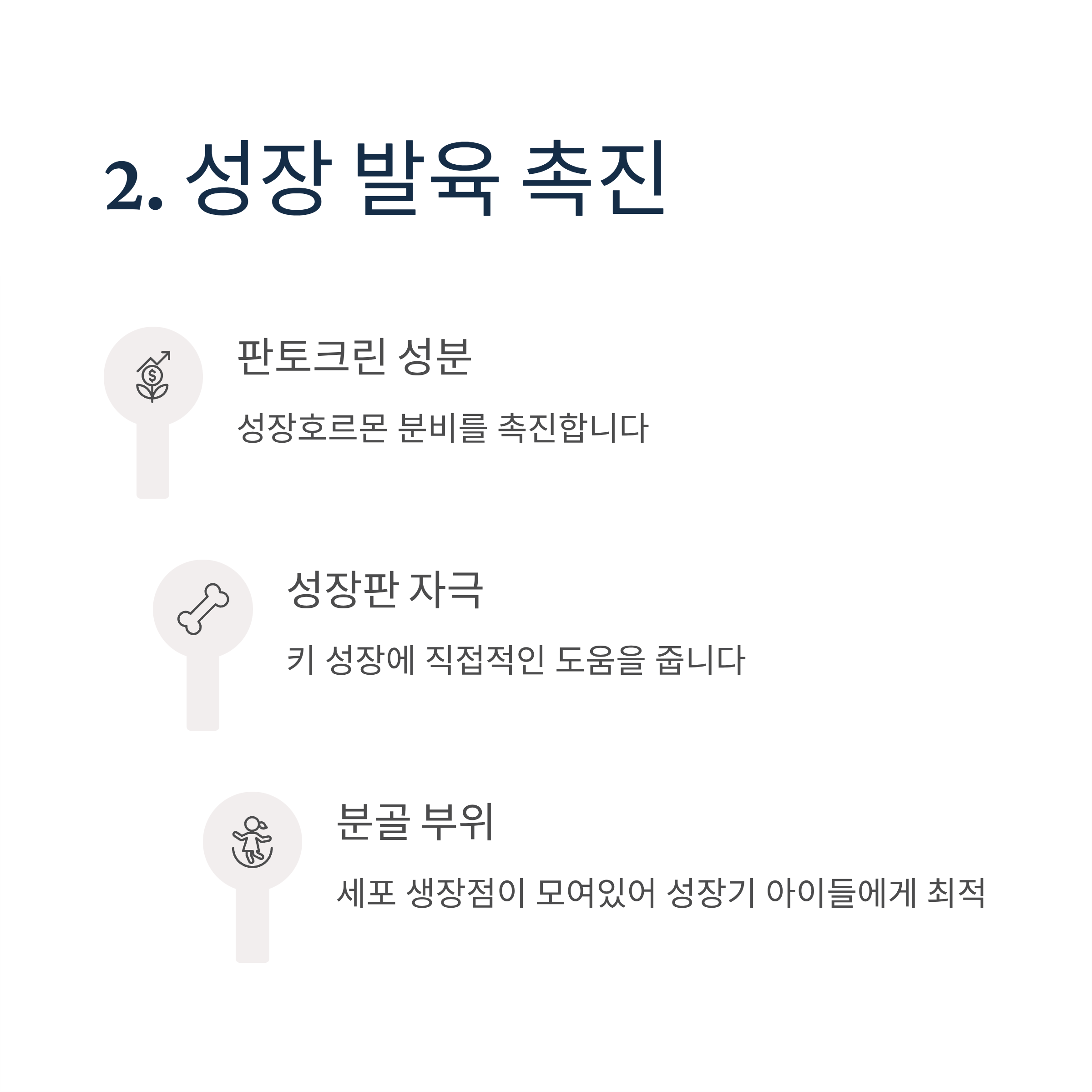 녹용의 판토크린 성분은 성장호르몬 분비를 촉진하고 성장판을 자극해 키 성장에 도움을 줍니다. 특히 녹용의 최상단 부위인 '분골'은 세포의 생장점이 모여있어 성장기 아이들에게 가장 효과적입니다.