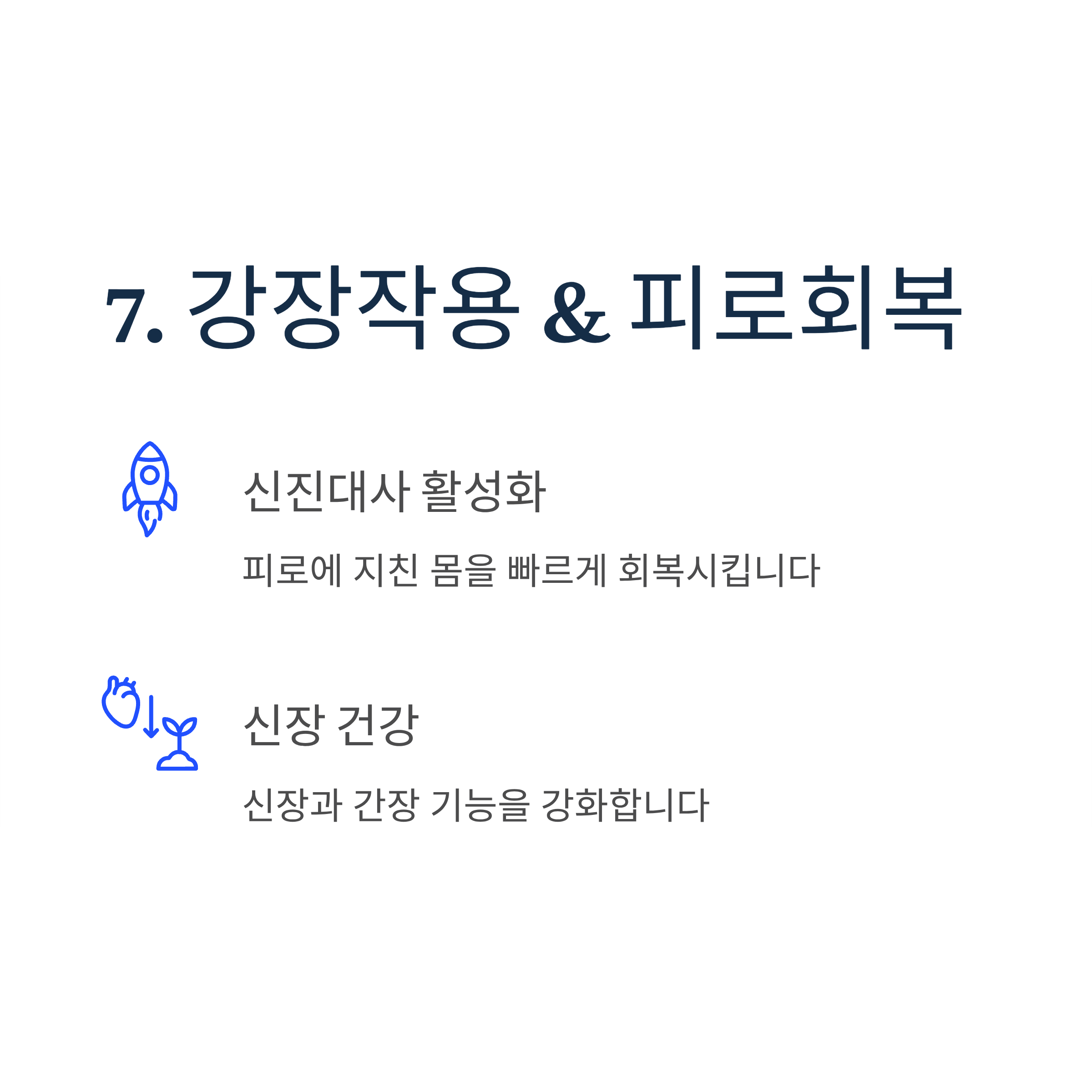 신진대사를 활발하게 해 피로에 지친 몸을 회복시키고, 신장과 간장을 건강하게 해 정력 증진에도 효과가 있습니다.