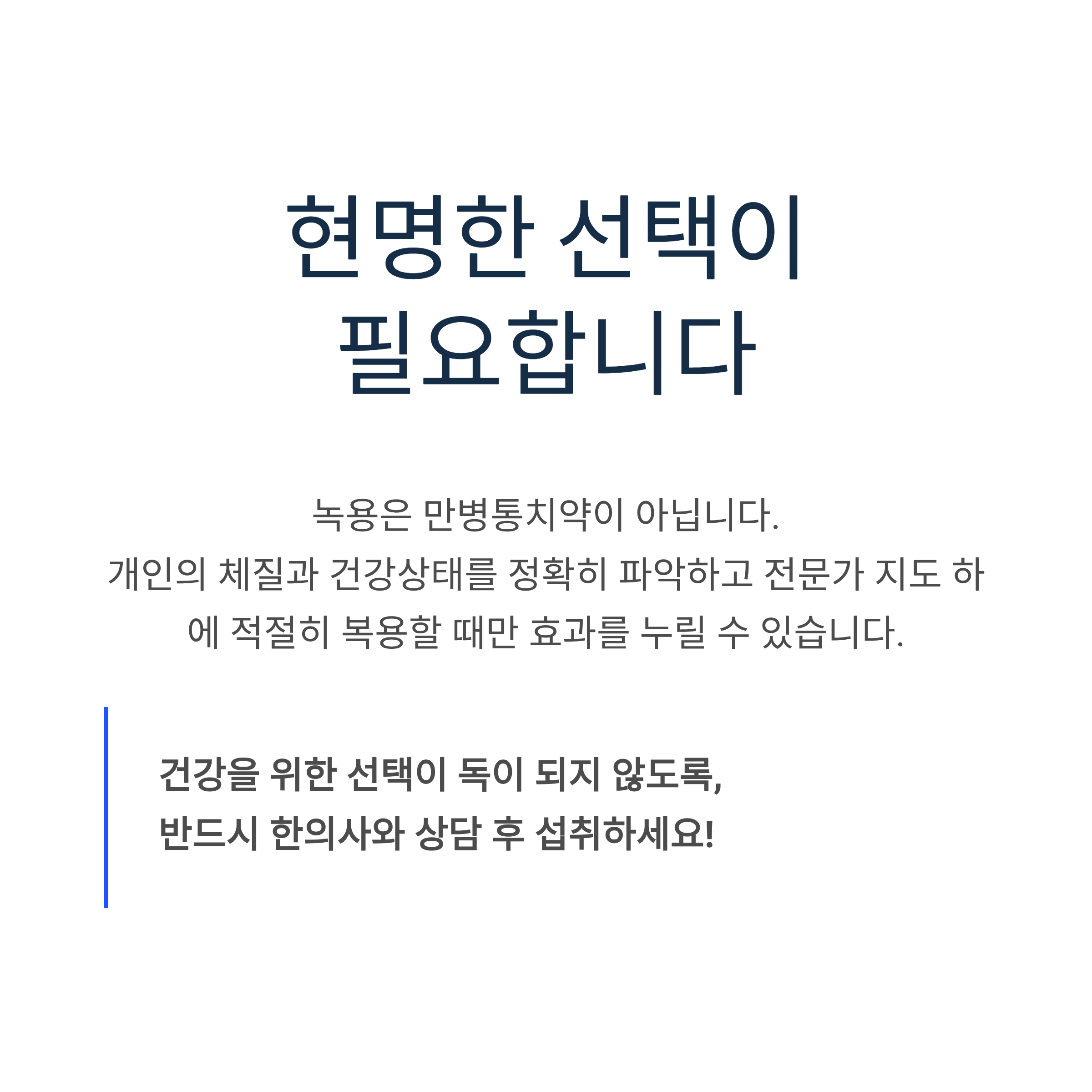 녹용은 분명 우수한 효능을 가진 한약재이지만, "만병통치약"이 아닙니다. 개인의 체질과 건강 상태를 정확히 파악하고, 전문가의 지도 하에 적절한 양을 복용할 때만 그 효과를 제대로 누릴 수 있습니다.