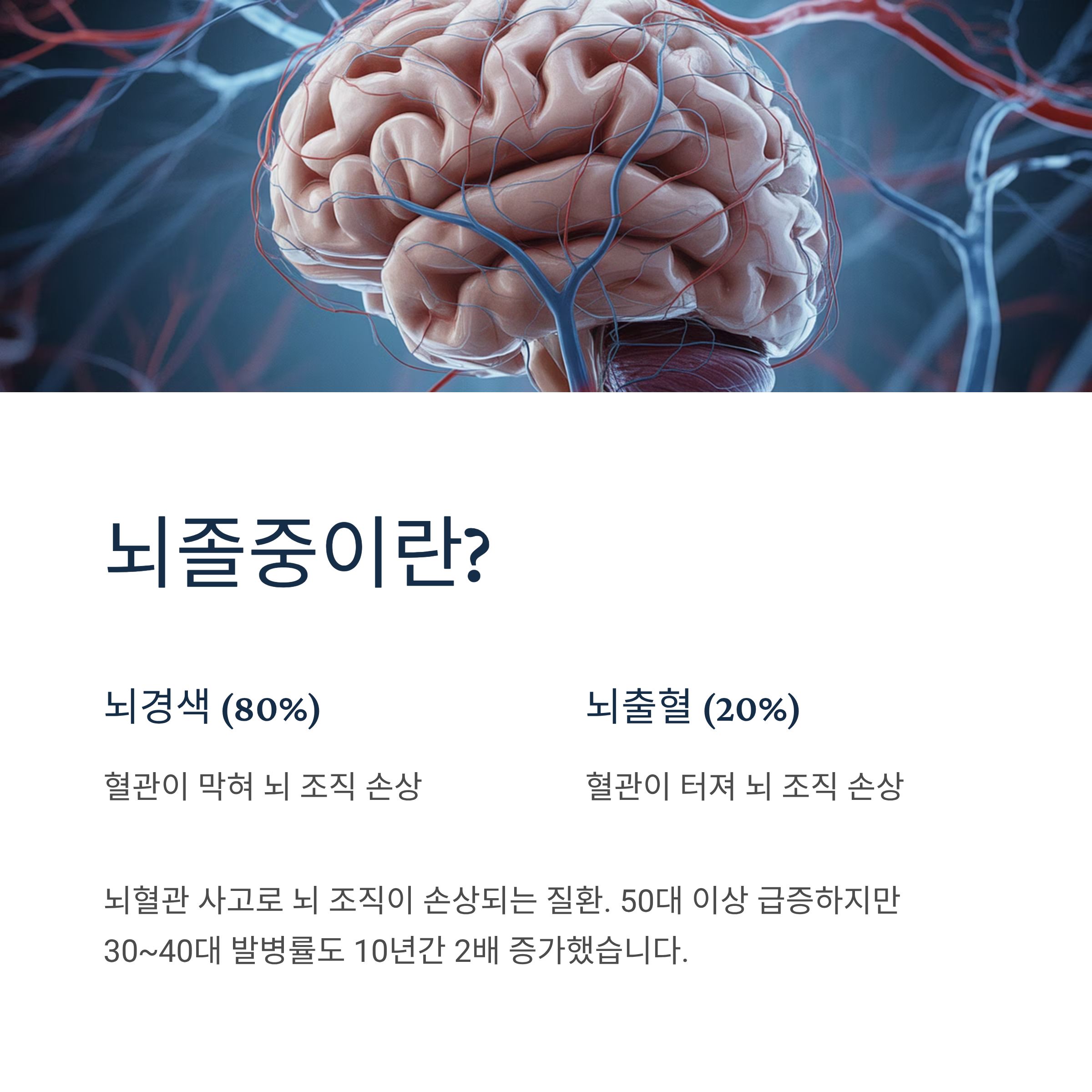 뇌졸중(Stroke)은 뇌혈관에 문제가 생겨 뇌 조직이 손상되는 질환의 총칭입니다. 크게 뇌경색(혈관이 막힘, 80%)과 뇌출혈(혈관이 터짐, 20%)로 나뉘며, 두 유형 모두 골든타임 내 치료가 생사를 가릅니다. 50대 이상에서 급증하지만, 최근 30~40대 젊은 층 발병률도 10년간 2배 증가했습니다.