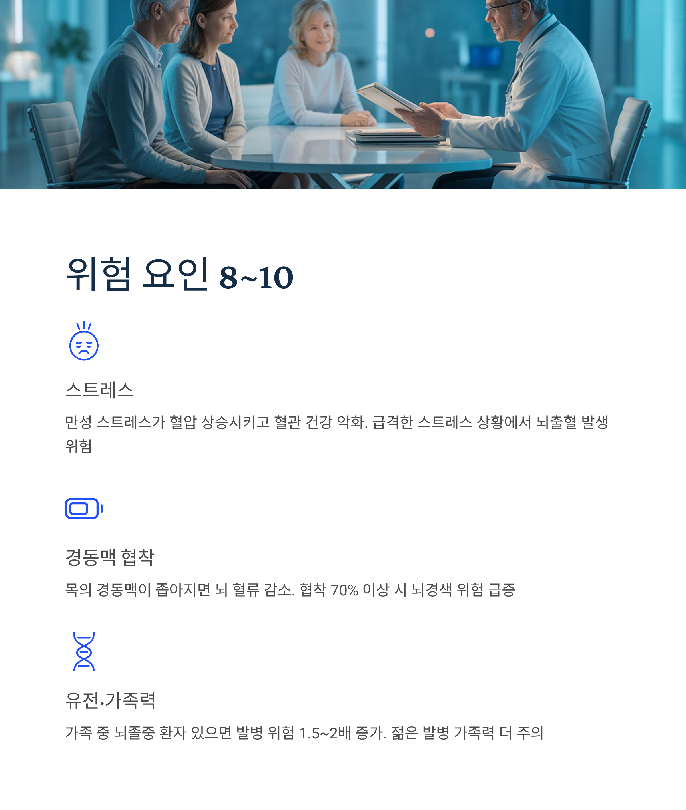 - 정기 검진: 50세 이상은 뇌 MRI, 경동맥 초음파 검사