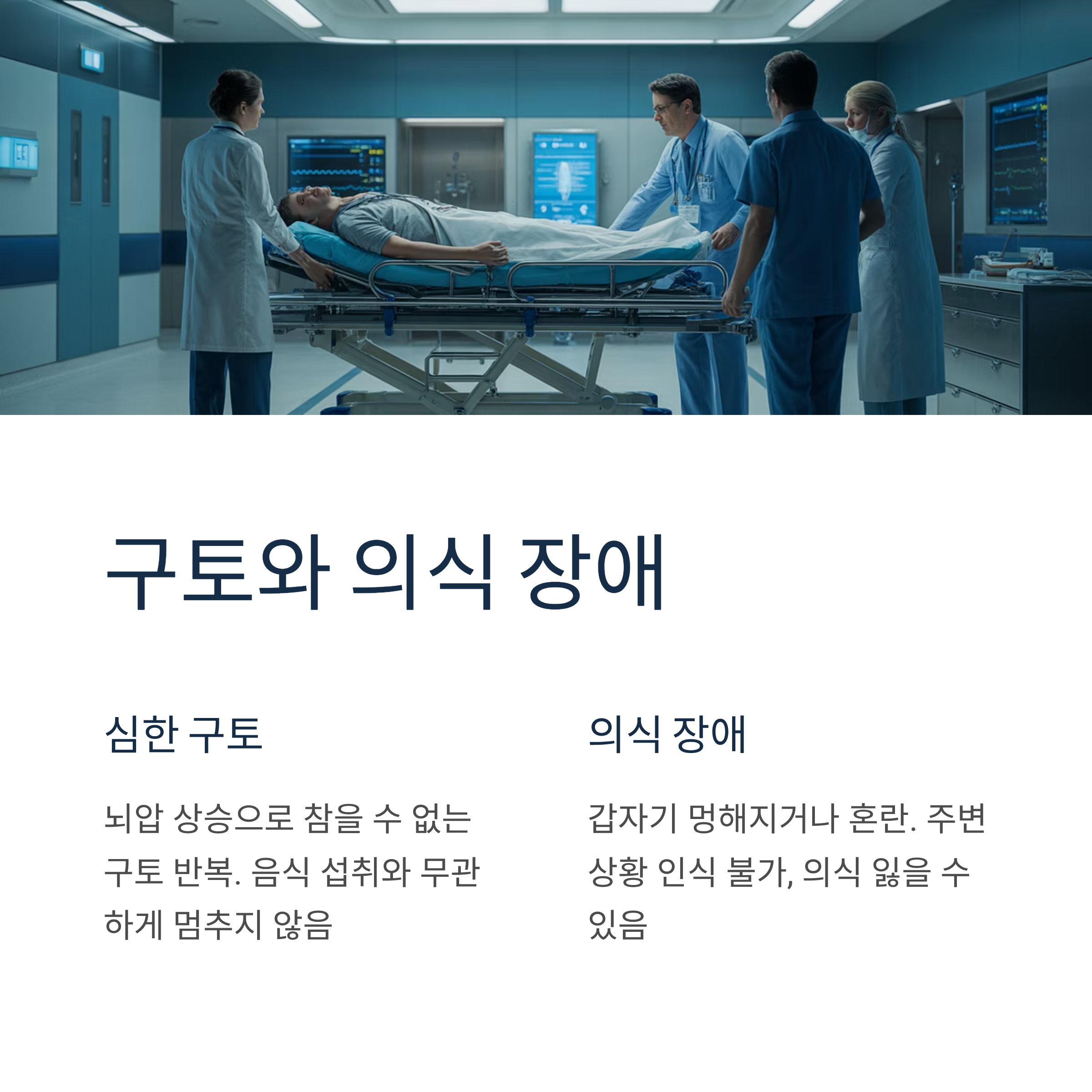 특히 뇌출혈에서 뇌압 상승으로 인해 참을 수 없는 구토가 반복됩니다. 음식 섭취와 무관하게 나타나며 멈추지 않습니다.