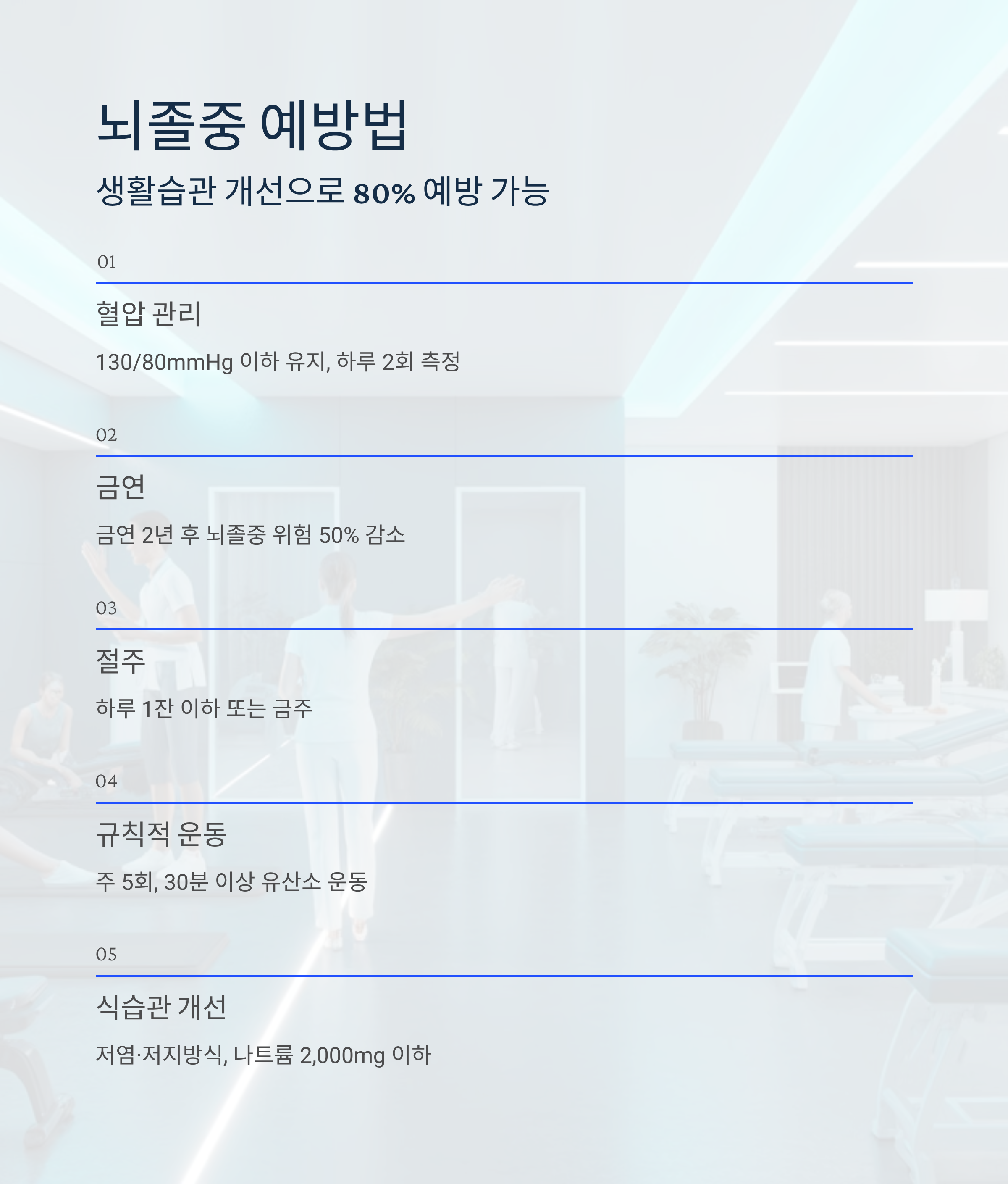 - 금연: 금연 2년 후 뇌졸중 위험 50% 감소