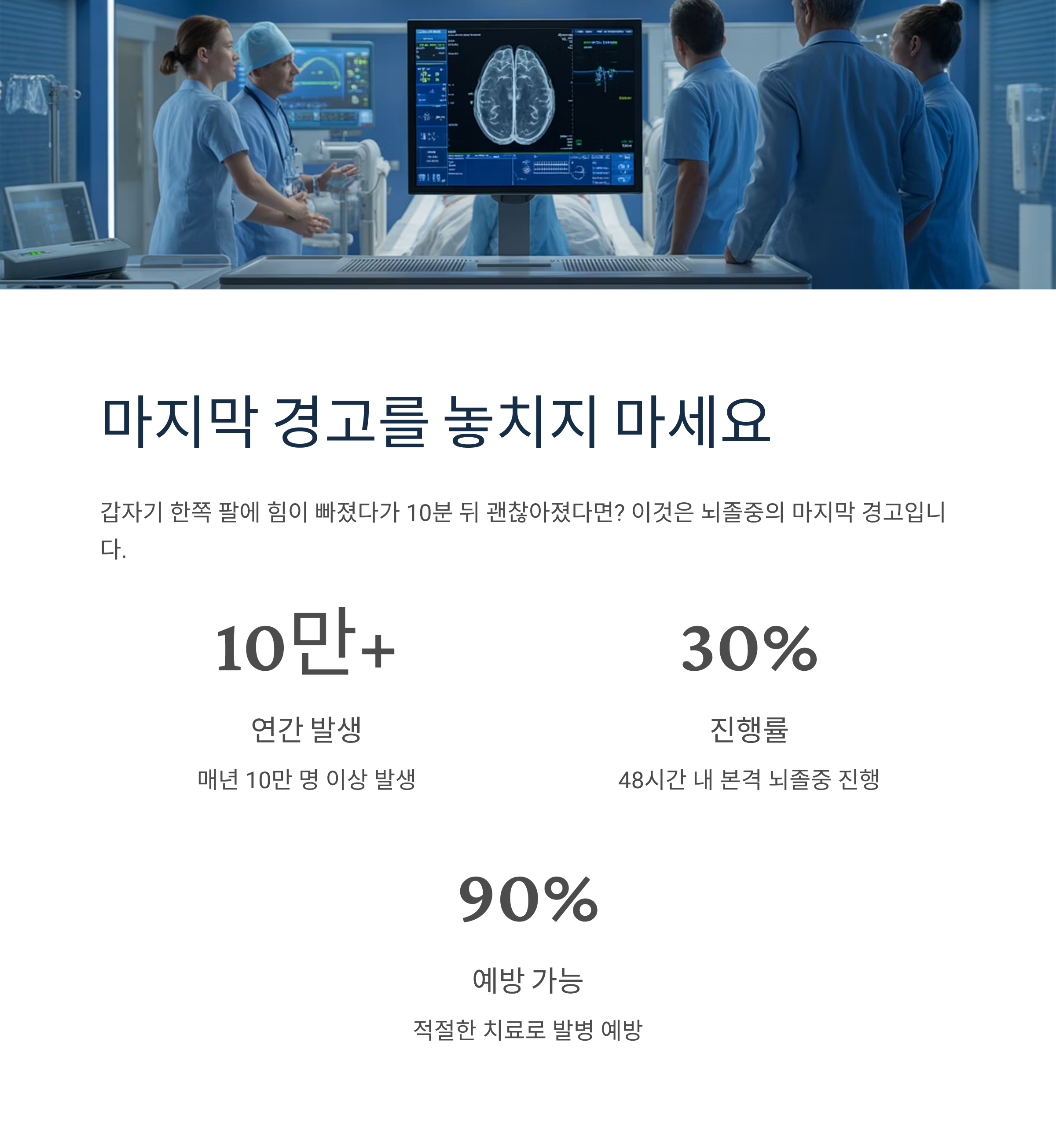 "갑자기 한쪽 팔에 힘이 빠졌다가 10분 뒤 괜찮아졌다면? 이것은 뇌졸중의 마지막 경고입니다." 뇌졸중은 국내 사망원인 4위, 단일질환 사망률 1위로 매년 10만 명 이상이 발생합니다. 2025년 대한뇌졸중학회 자료에 따르면 전조증상 발생 후 48시간 내 30%가 본격적인 뇌졸중으로 진행되지만, 이 시기에 적절한 치료를 받으면 발병을 90% 이상 예방할 수 있다고 합니다. 생명을 지키는 전조증상을 지금 확인하세요.