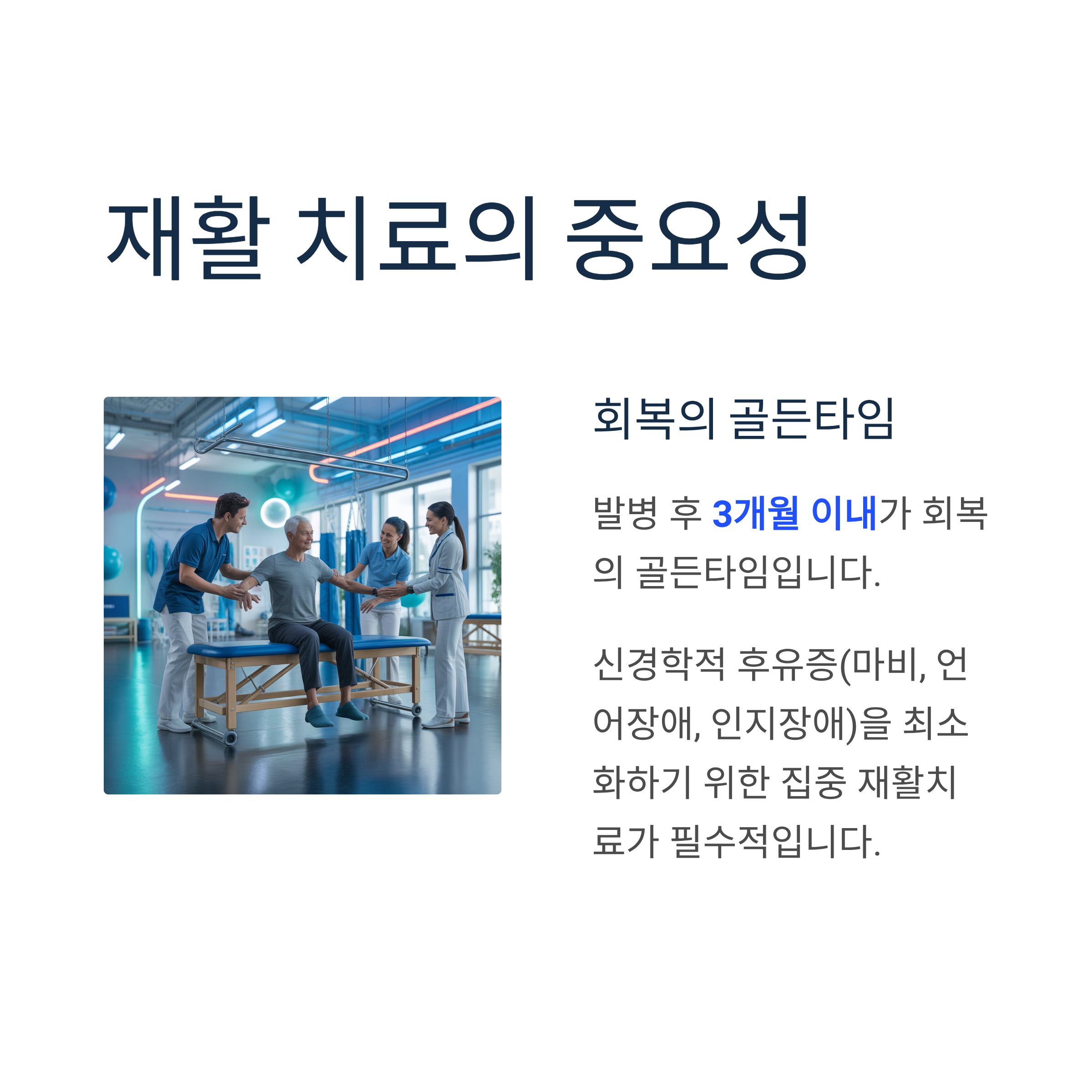 급성기 치료 후 신경학적 후유증(마비, 언어장애, 인지장애)을 최소화하기 위한 집중 재활치료가 필수적입니다. 발병 후 3개월 이내가 회복의 골든타임입니다.