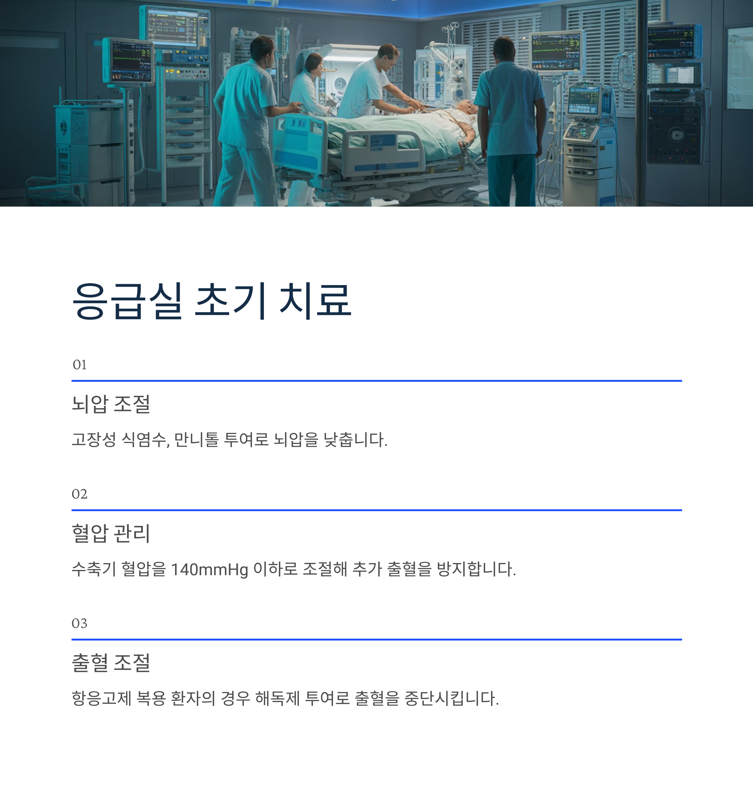 - 혈압 관리: 수축기 혈압을 140mmHg 이하로 조절해 추가 출혈을 방지합니다.