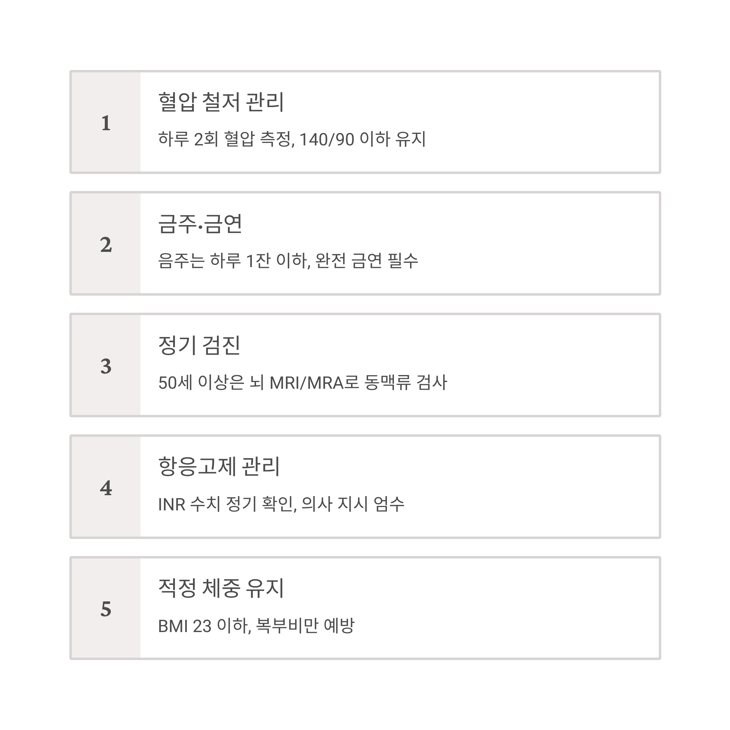 - 정기 검진: 50세 이상은 뇌 MRI/MRA로 동맥류 검사