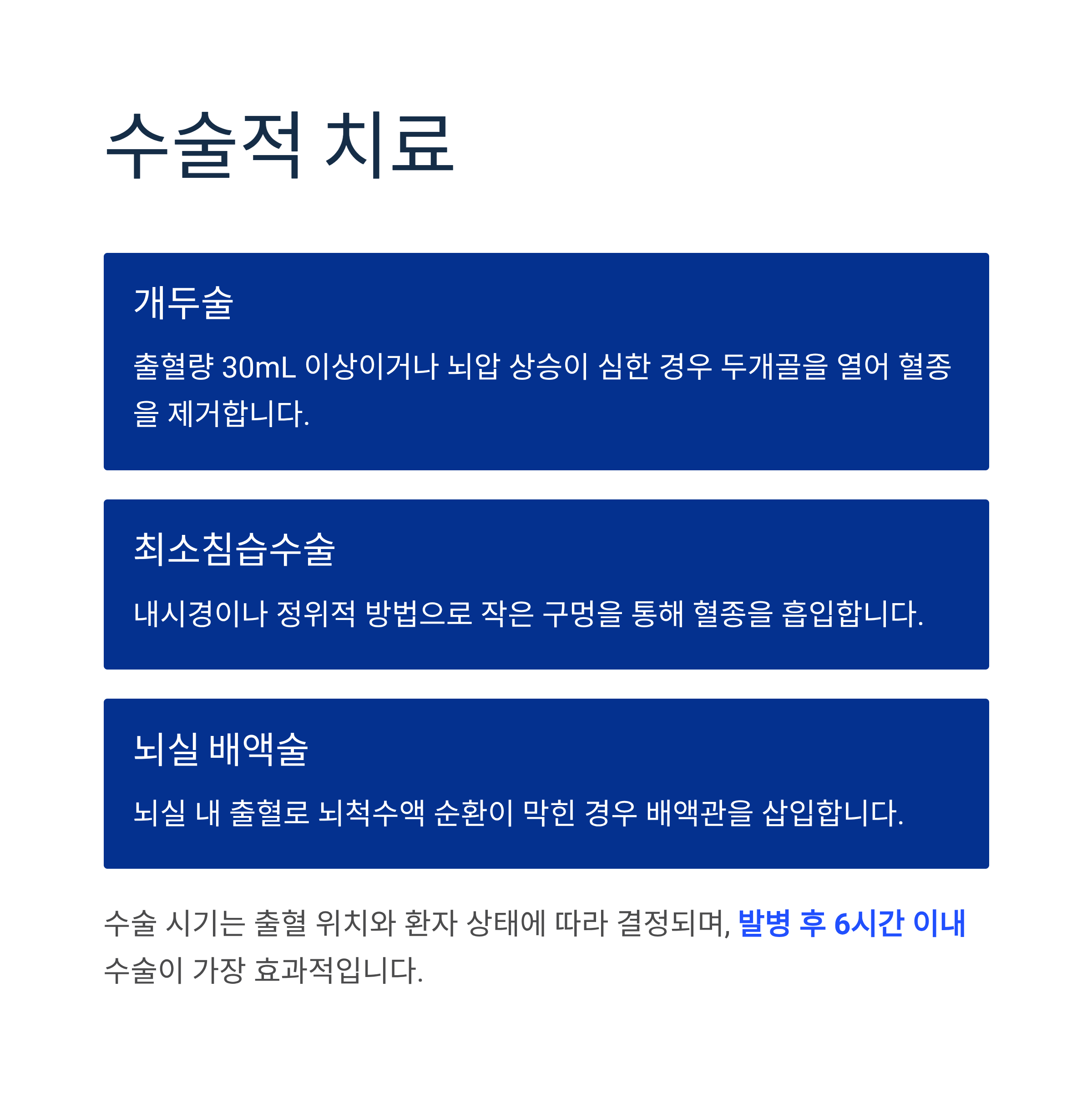 수술 시기는 출혈 위치와 환자 상태에 따라 결정되며, 일반적으로 발병 후 6시간 이내 수술이 가장 효과적입니다.