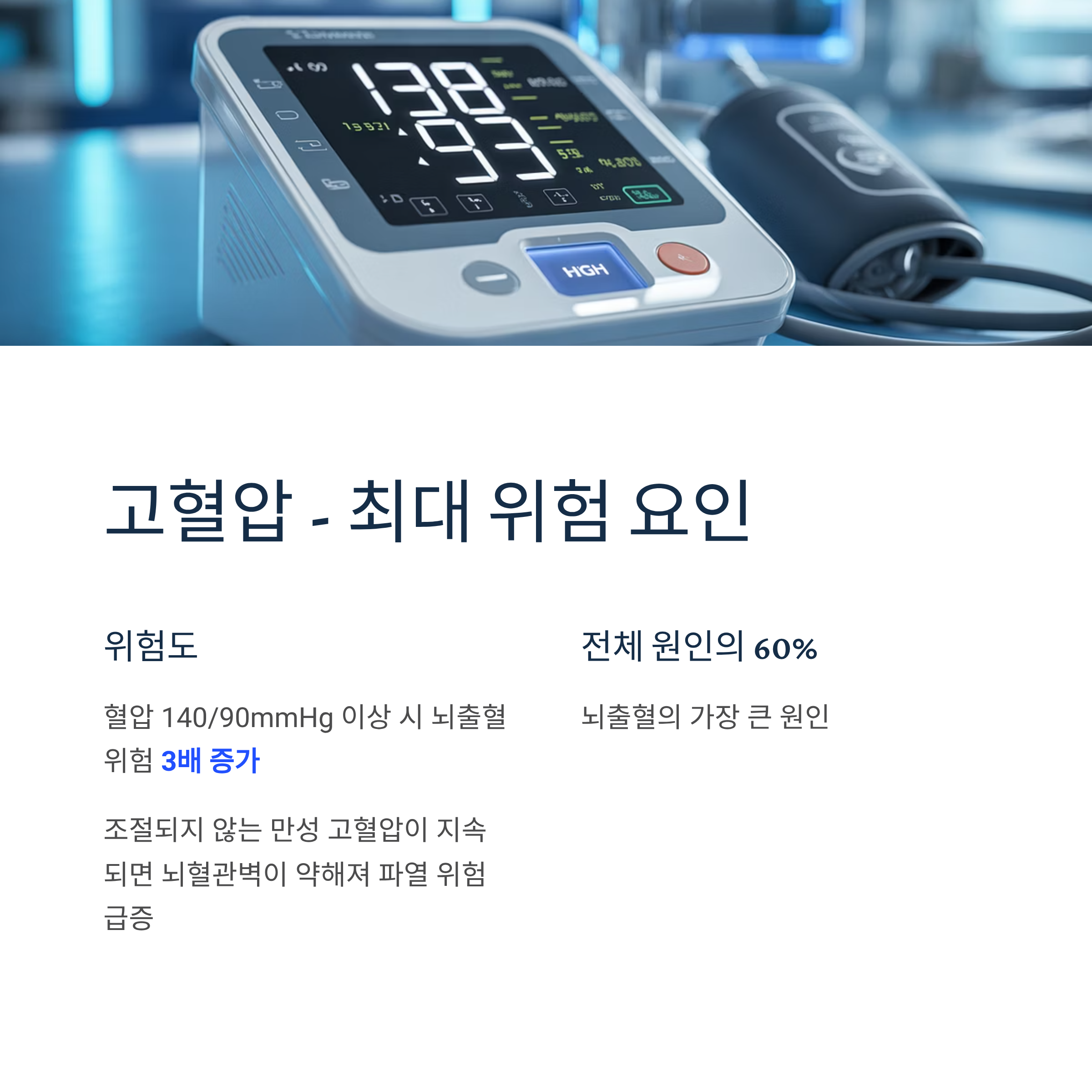 뇌출혈의 가장 큰 원인입니다. 혈압이 140/90mmHg 이상인 경우 뇌출혈 위험이 3배 증가하며, 특히 조절되지 않는 만성 고혈압이 지속되면 뇌혈관벽이 약해져 파열 위험이 높아집니다.