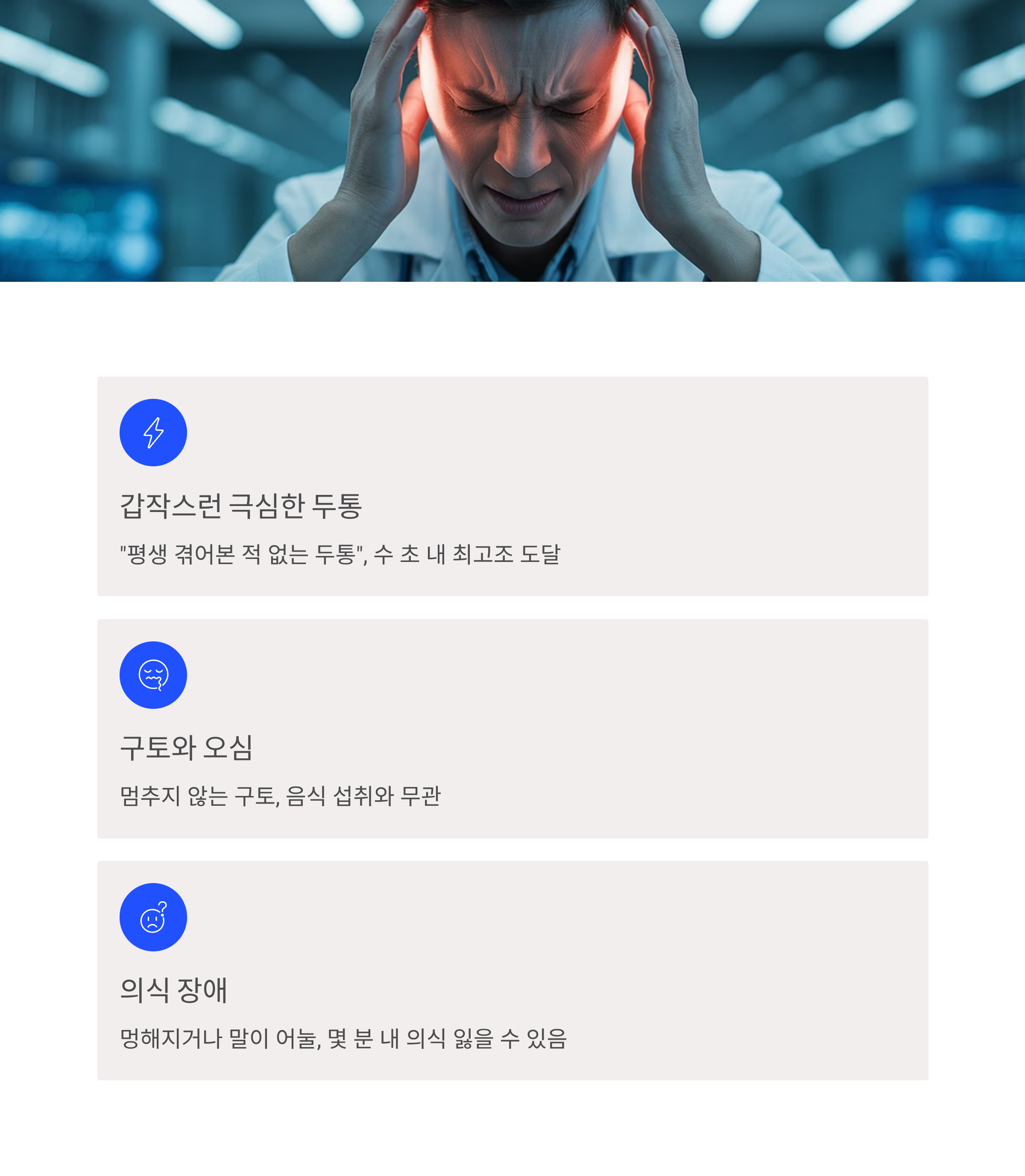 "평생 겪어본 적 없는 두통", "머리를 망치로 맞은 것 같은 통증"으로 표현되는 극심한 두통이 갑자기 발생합니다. 일반 두통과 달리 진통제로 전혀 완화되지 않으며, 수 초 내에 최고조에 달합니다.
