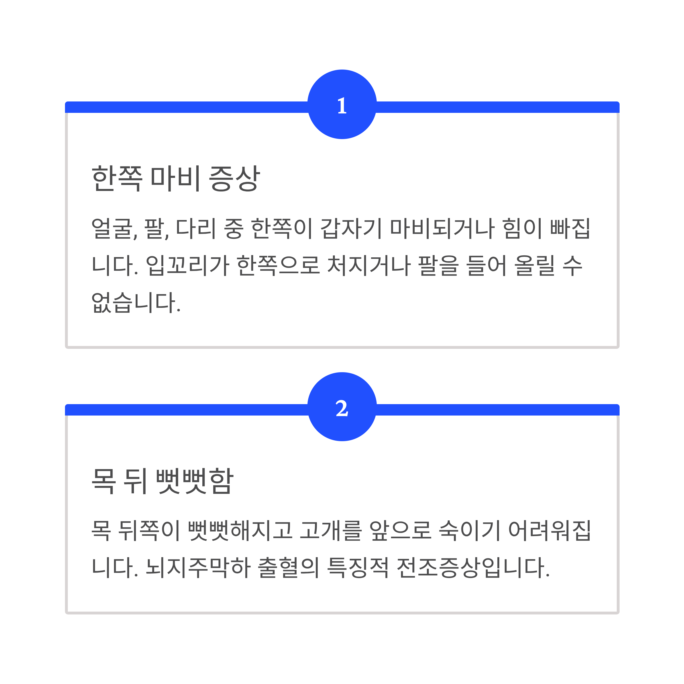 목 뒤쪽이 뻣뻣해지고 고개를 앞으로 숙이기 어려워집니다. 뇌막 자극으로 인한 증상으로, 뇌지주막하 출혈의 특징적 전조증상입니다.