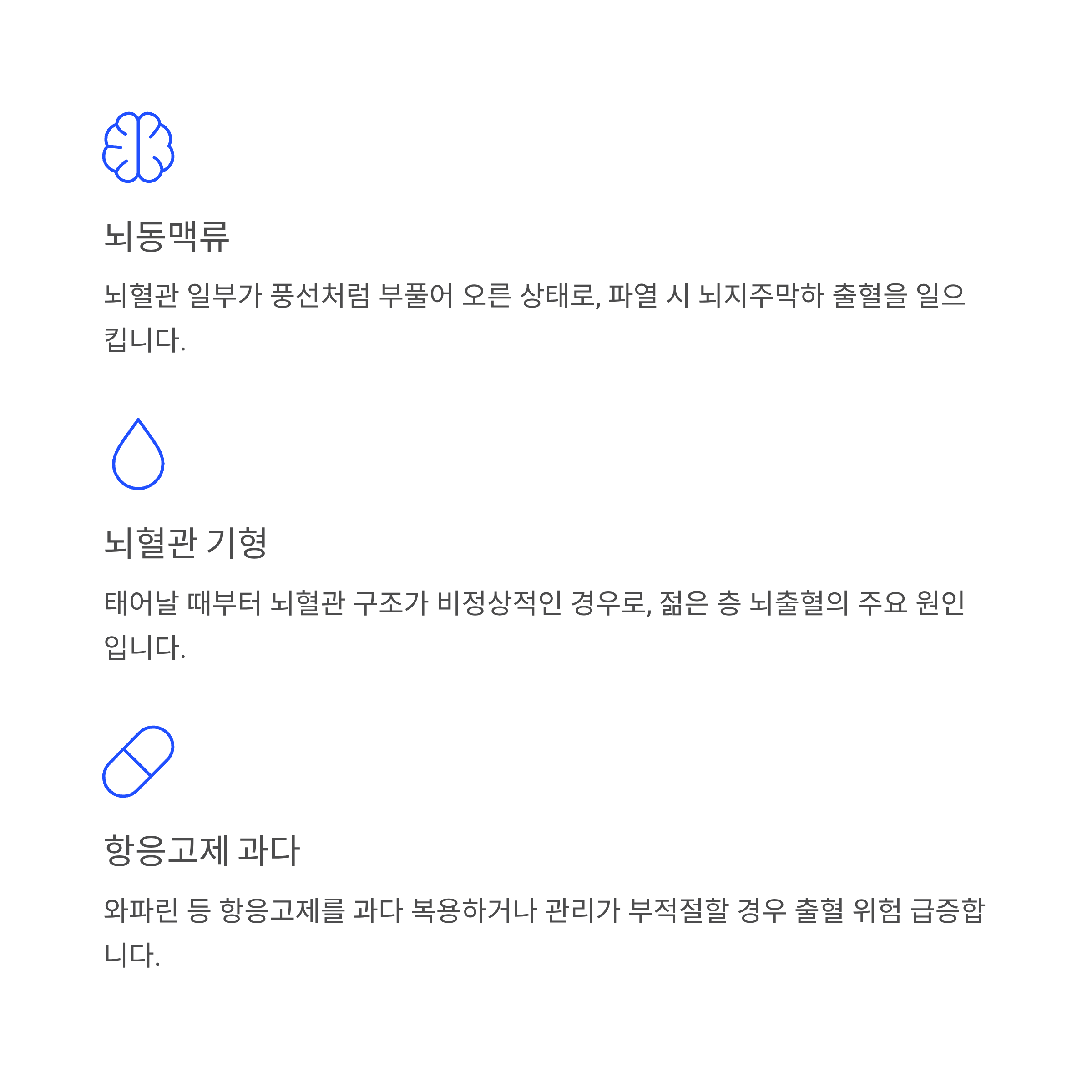 뇌혈관 일부가 풍선처럼 부풀어 오른 상태로, 파열 시 뇌지주막하 출혈을 일으킵니다. 선천적 요인과 후천적 혈압 상승이 복합적으로 작용합니다.