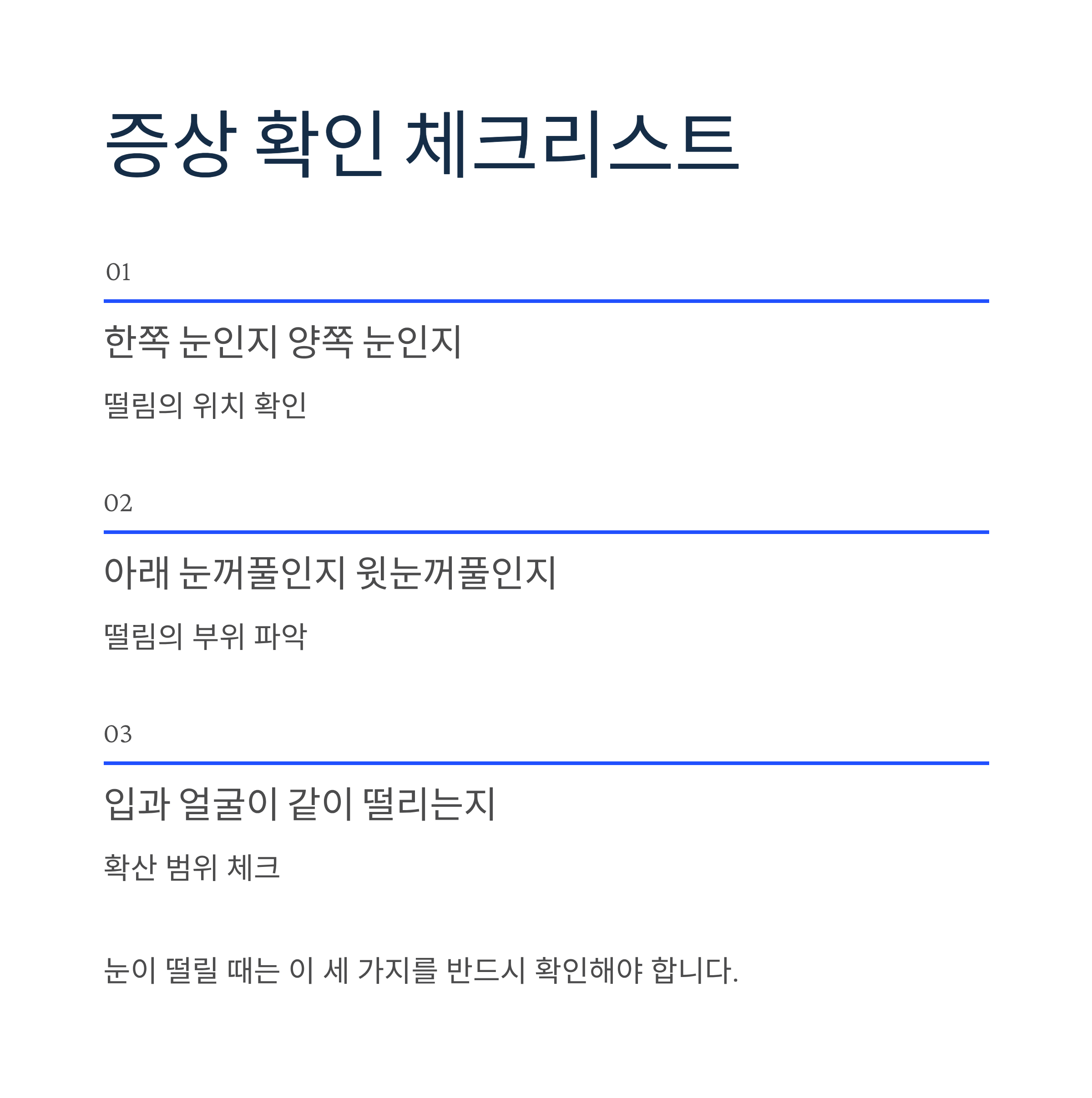 눈 떨림은 대부분 일시적인 증상이지만, 증상의 패턴과 지속 기간을 주의 깊게 관찰해야 합니다. 마그네슘 영양제만 먹기보다는 충분한 휴식, 카페인 조절, 스트레스 관리가 우선입니다.