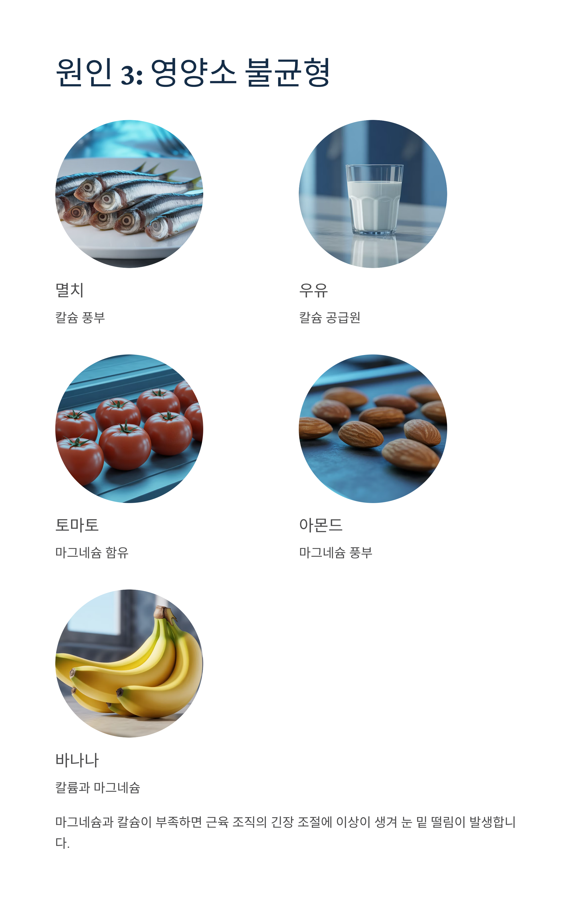 마그네슘과 칼슘이 부족하면 근육 조직의 긴장 조절에 이상이 생겨 눈 밑 떨림과 같은 근육경련이 발생할 수 있습니다. 멸치, 우유, 토마토, 아몬드, 바나나 등을 섭취하면 도움이 됩니다.